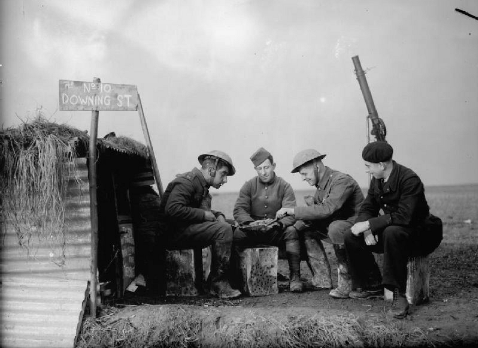 Pozemní personál britského a francouzského letectva si krátí dlouhou chvíli u krytu s nápisem upomínajícím na adresu britských premiérů