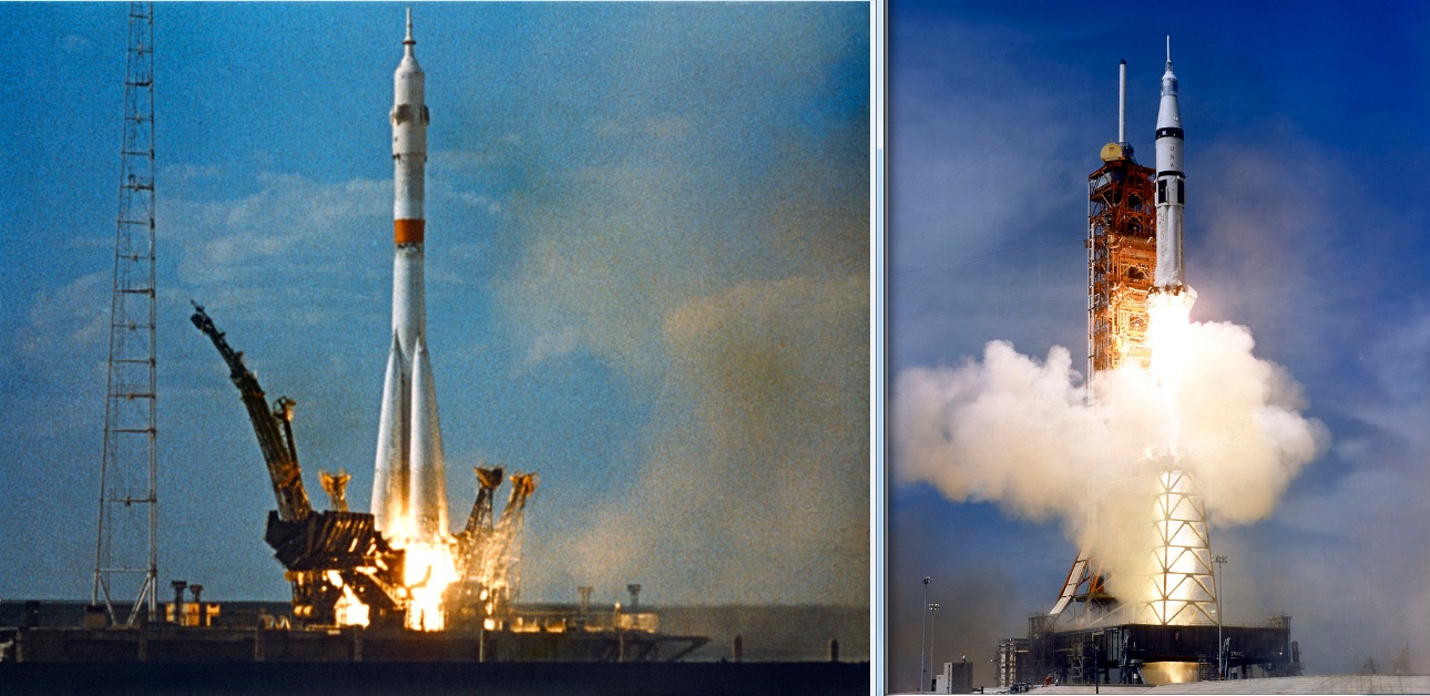 Start obou lodí: vlevo Sojuz na raketě Sojuz-U, vpravo Apollo na Saturnu IB