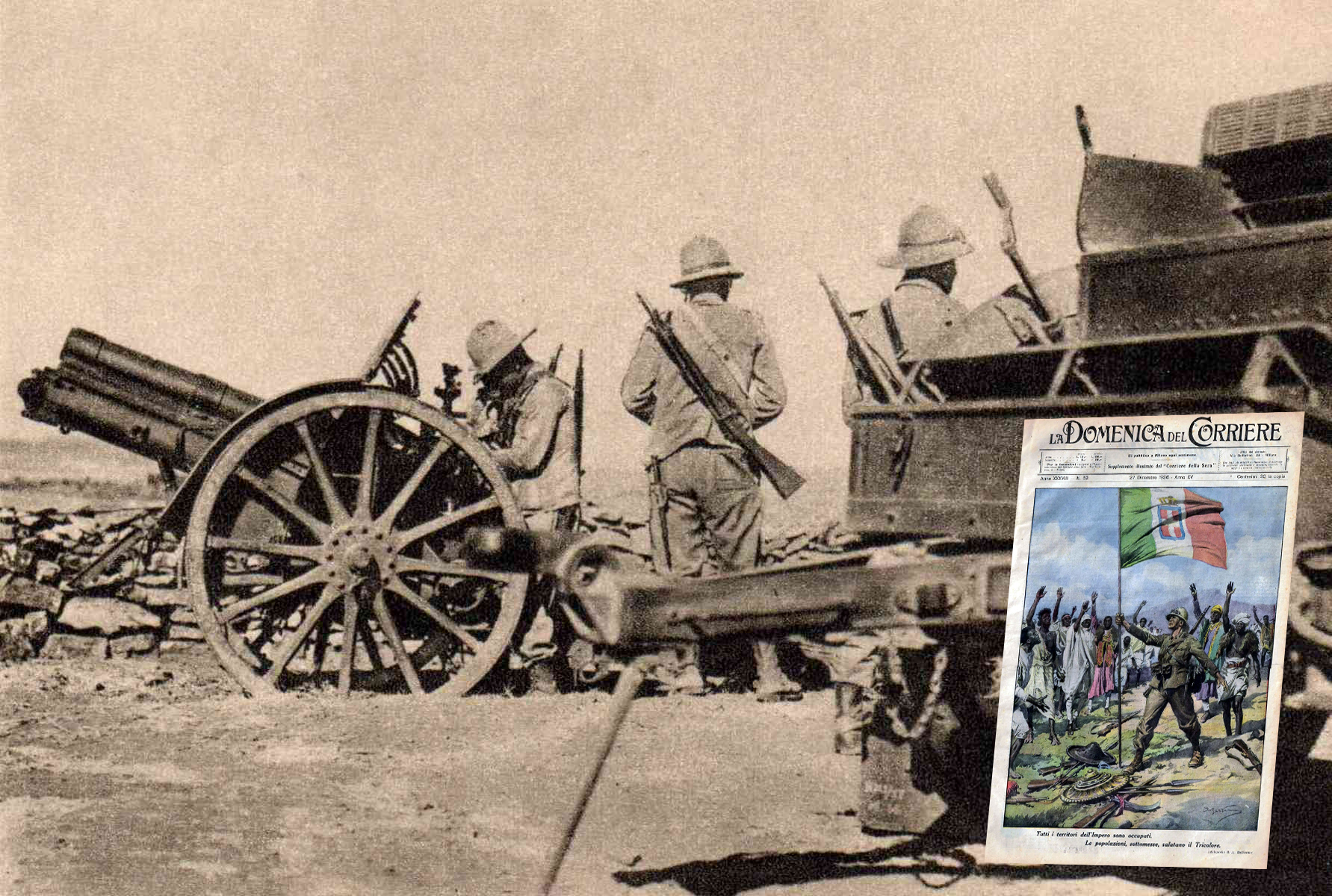 Italské dělostřelectvo u Tembienu. Ve výřezu obálka časopisu oslavující italské vítězství. Během druhé světové války už mnoho podobných nevzniklo.