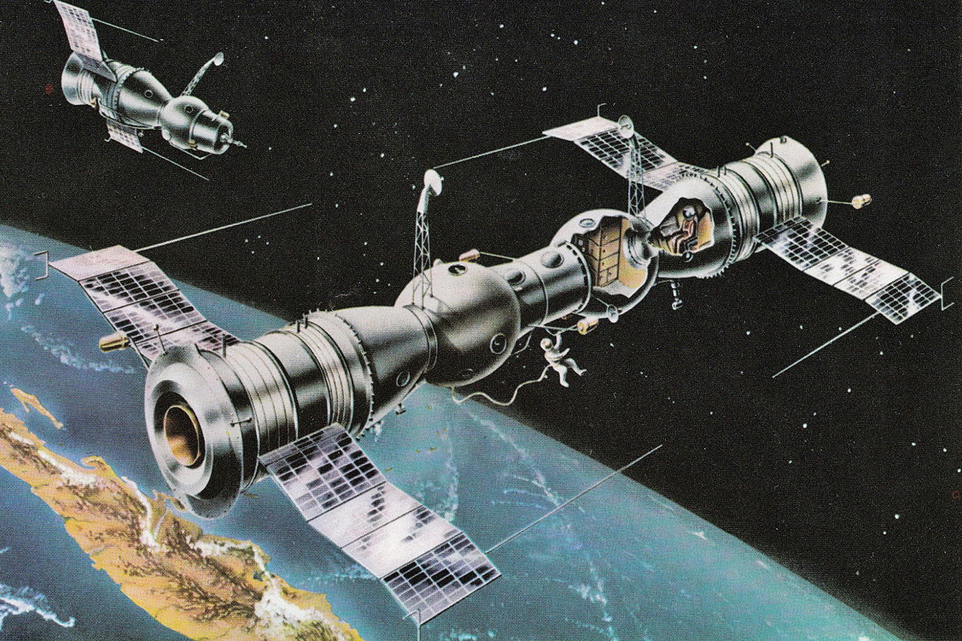 Spojení Sojuzu 7 a 8 včetně přestupu kosmonauta ve skafandru bohužel zůstalo jen v představách ilustrátora.
