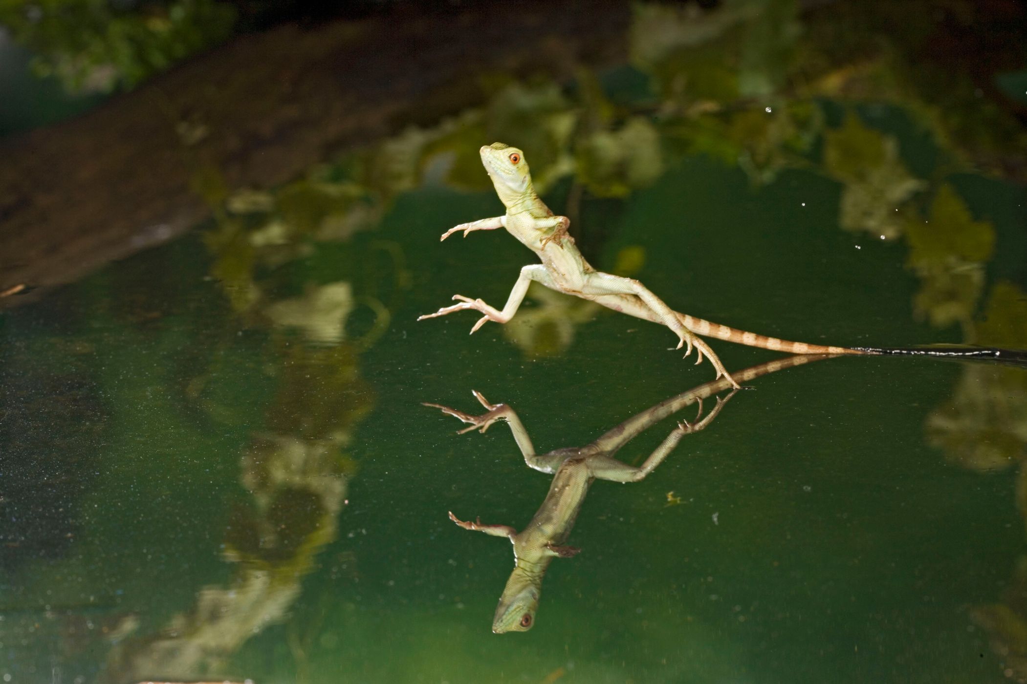 Mladý bazilišek zelený (Basiliscus plumifrons) názorně předvádí, jak umí kráčet po vodě. (foto: Shutterstock)