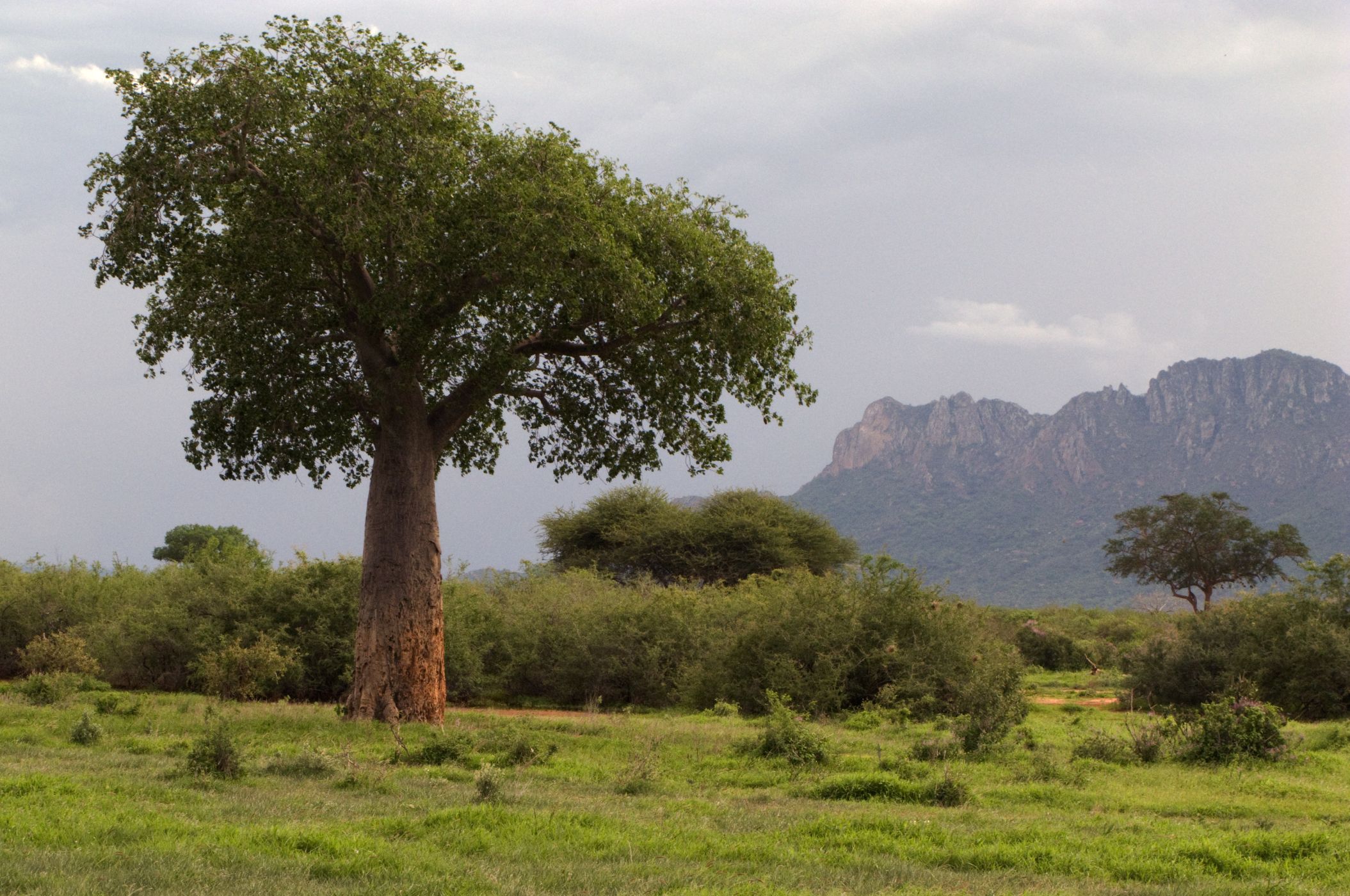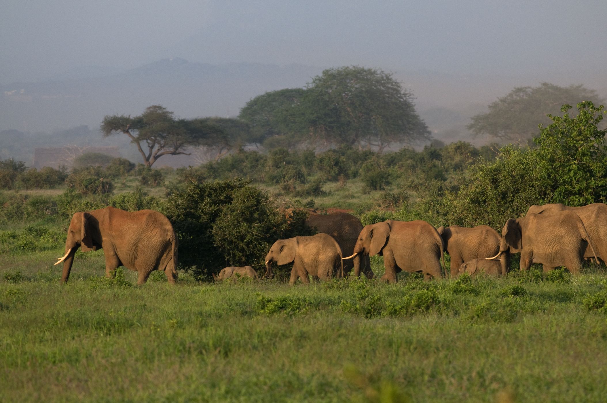 Stádo slonů časně ráno v zelení zdobeném Tsavo West.
