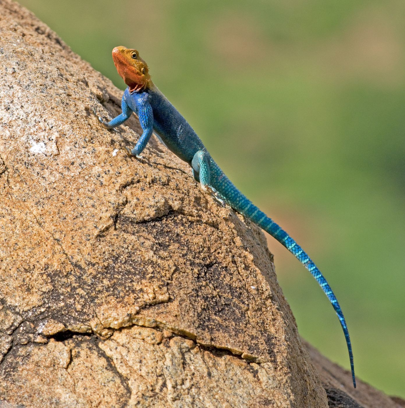 Samec agamy osadní obhlíží z vrcholu skály své teritorium.
