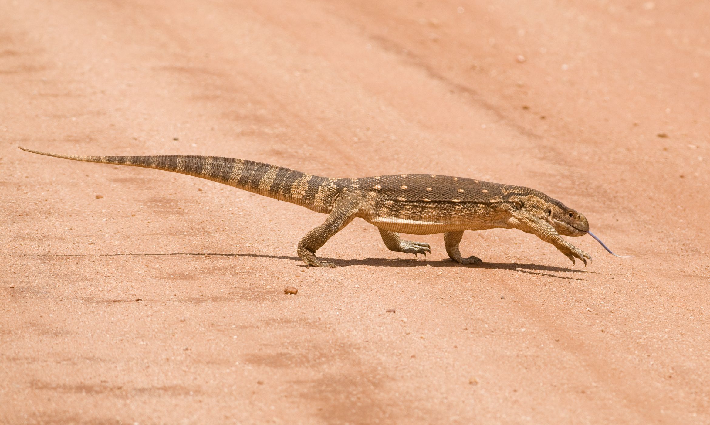Přes cestu přebíhá asi metr dlouhý varan stepní.