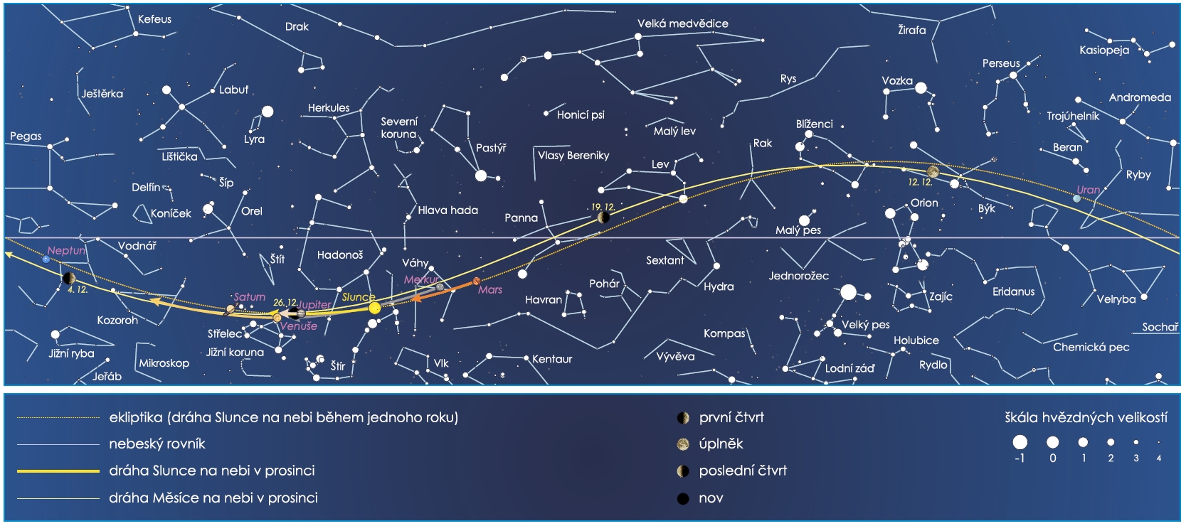 Obdélníková mapa uvádí přibližné polohy významných těles Sluneční soustavy na prosincovém nebi. U Měsíce jsou zvýrazněny pozice (včetně přesného data), kdy nastává první čtvrt, úplněk, poslední čtvrt a nov.