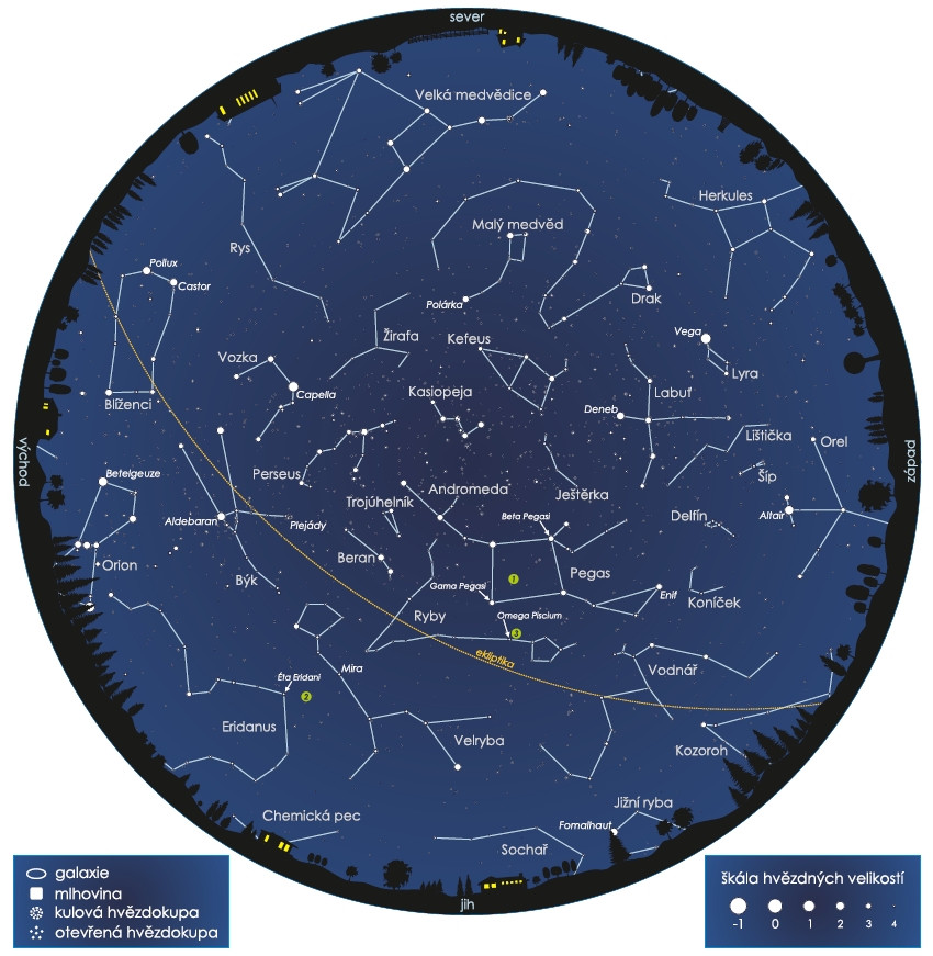 Kruhová mapa zobrazuje podobu nočního nebe 15. prosince 2019 v 19:00 středoevropského času (SEČ). Na počátku měsíce platí pro 20:00 SEČ, na jeho konci pro 18:00 SEČ.
