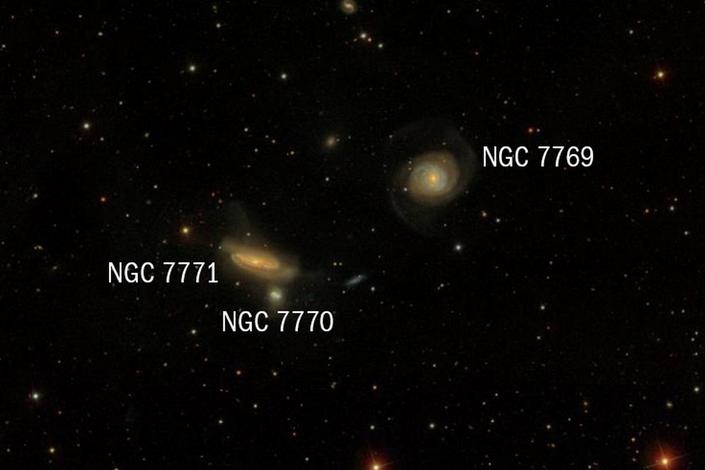 S pozorováním začněte u nejsnazšího cíle – galaktického tripletu v souhvězdí Pegase, který tvoří hvězdné ostrovy NGC 7769, NGC 7771 a NGC 7770.