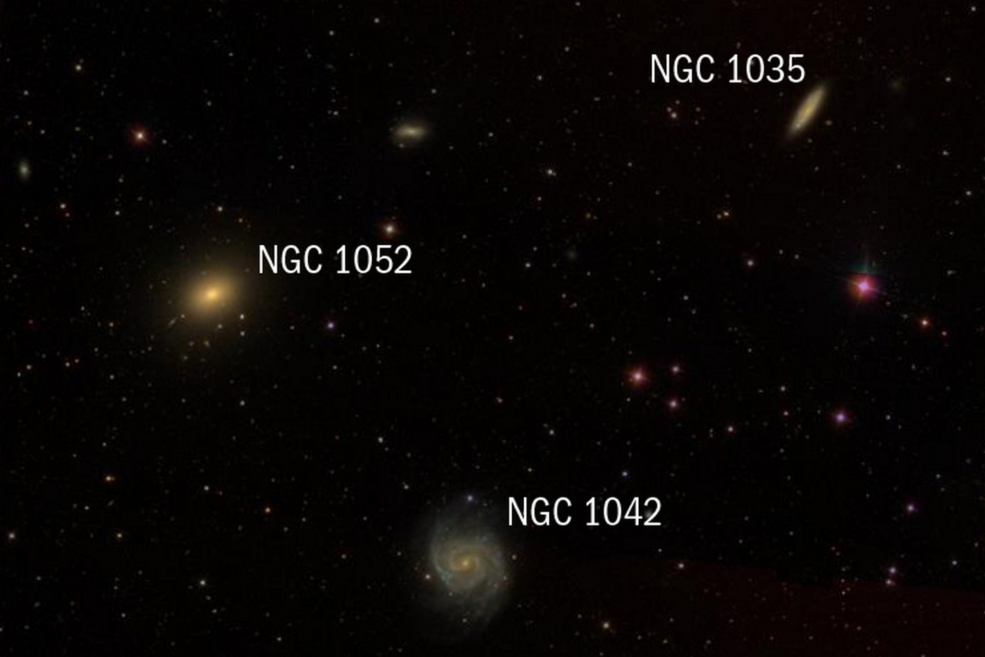 Za dalším galaktickým triem se přesuňte do jihovýchodního cípu souhvězdí Velryby, poblíž hranice se sousedním souhvězdím Eridanu. Právě tam se nachází triplet složený z galaxií NGC 1035, NGC 1042 a NGC 1052.