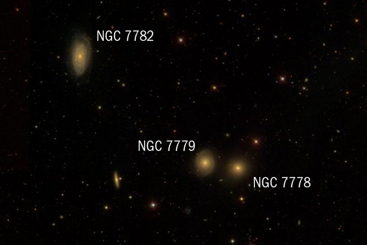 Poslední pohledný triplet, složený z NGC 7782, NGC 7778 a NGC 7779, okupuje souhvězdí Ryb nedaleko stálice čtvrté velikosti Omega Piscium.