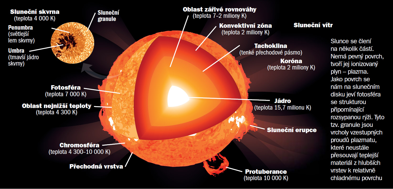 Slunce se člení na několik částí. Nemá pevný povrch, tvoří jej ionizovaný plyn – plazma. Jako povrch se nám na slunečním disku jeví fotosféra se strukturou připomínající rozsypanou rýži. Tyto tzv. granule jsou vrcholy vzestupných proudů plazmatu, které neustále přesouvají teplejší materiál z hlubších vrstev k relativně chladnému povrchu