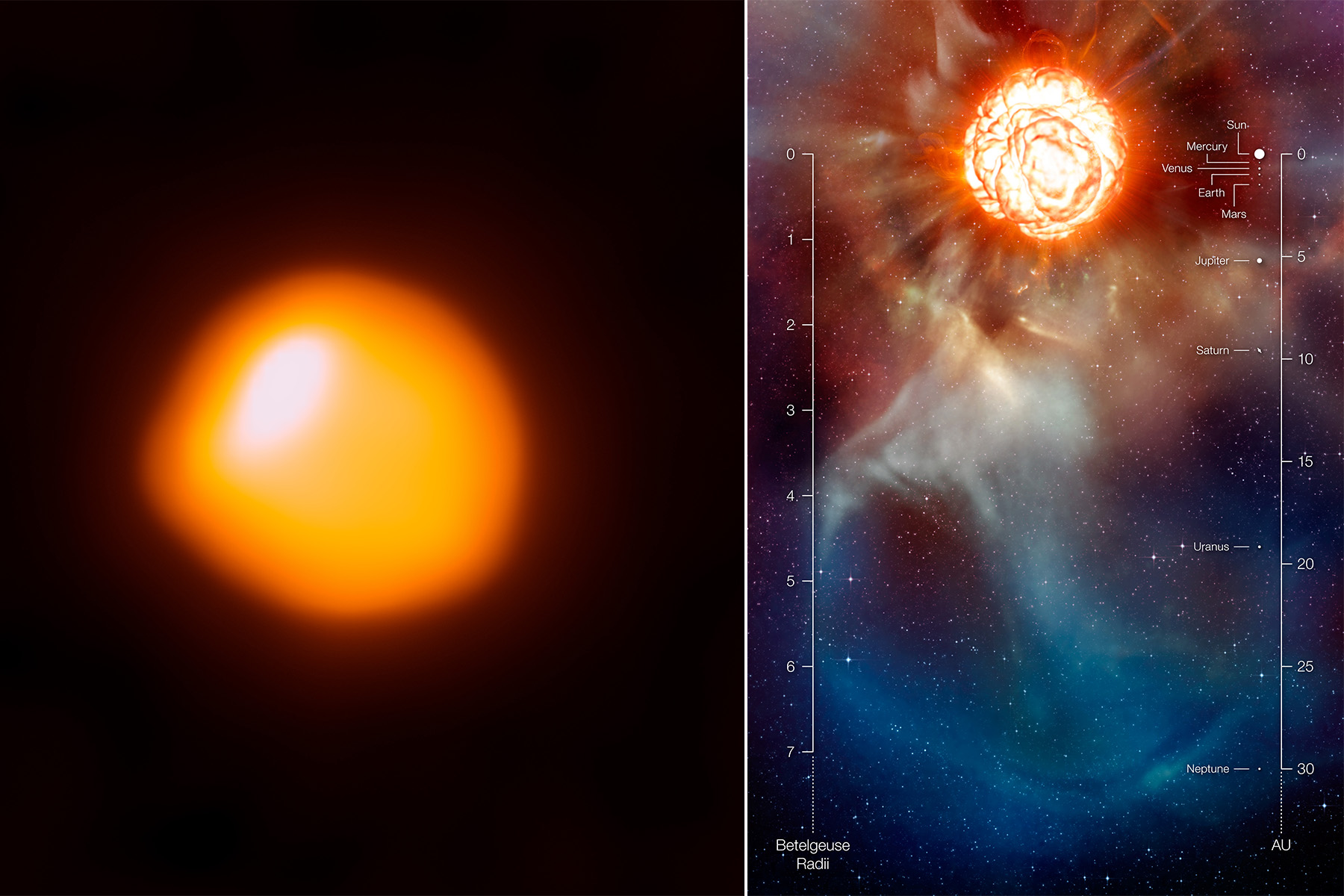 Betelgeuse na snímku soustavy ALMA a vizualizace zobrazující obrovský oblak plynu o přibližné velikosti naší Sluneční soustavy.