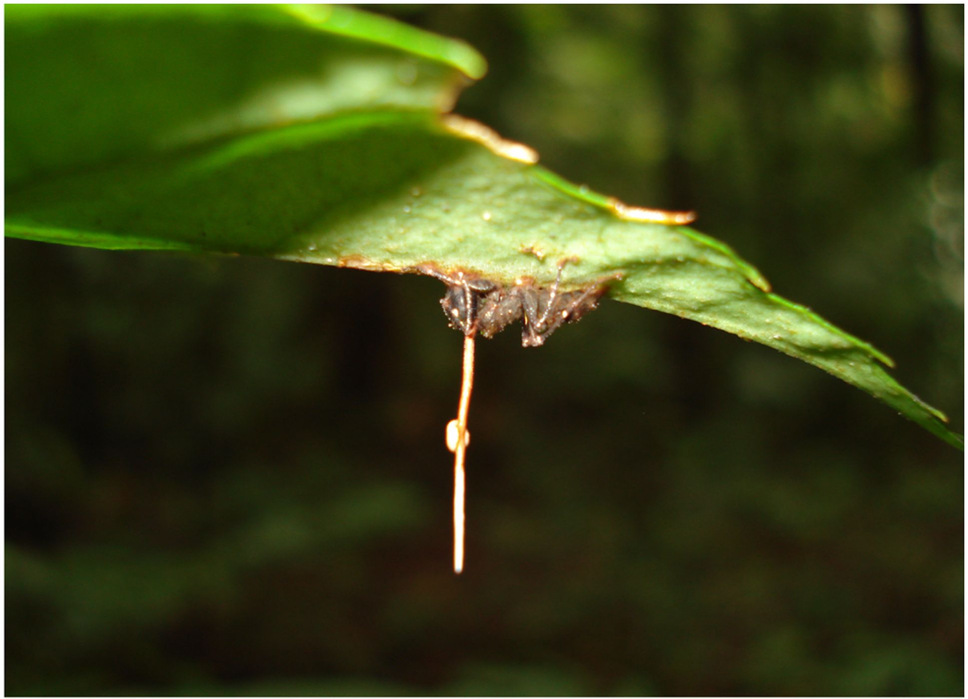Mravenec nakažený houbou Ophiocordyceps unilateralis se pevně zakousne do cévy na spodní straně listu. Parazit mravenci už nedovolí, aby se pustil.