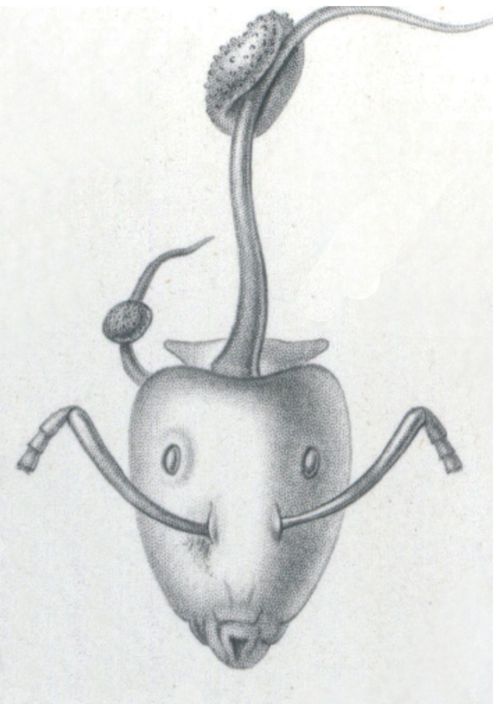 Původní kresba z roku 1865, která ukazuje parazitickou houbu Ophiocordyceps unilateralis vyrůstající ze zátylku mravence.