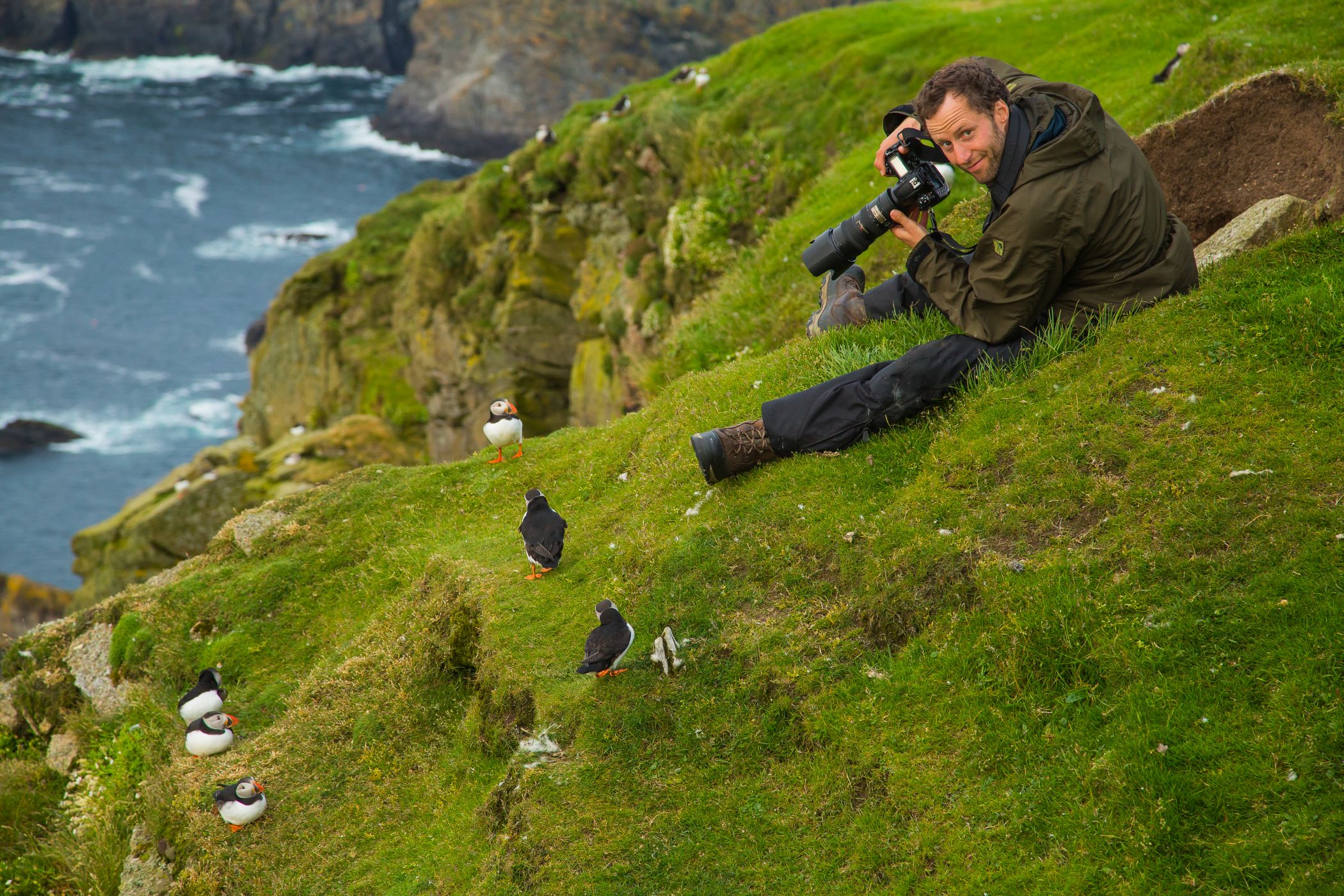 Papuchalk bělobradý(Fratercula arctica) má pro fotografy velkou přitažlivost. Na Shetlandech patří pobřežní hnízdiště těchto mořských ptáků k nejvyhledávanějším místům.