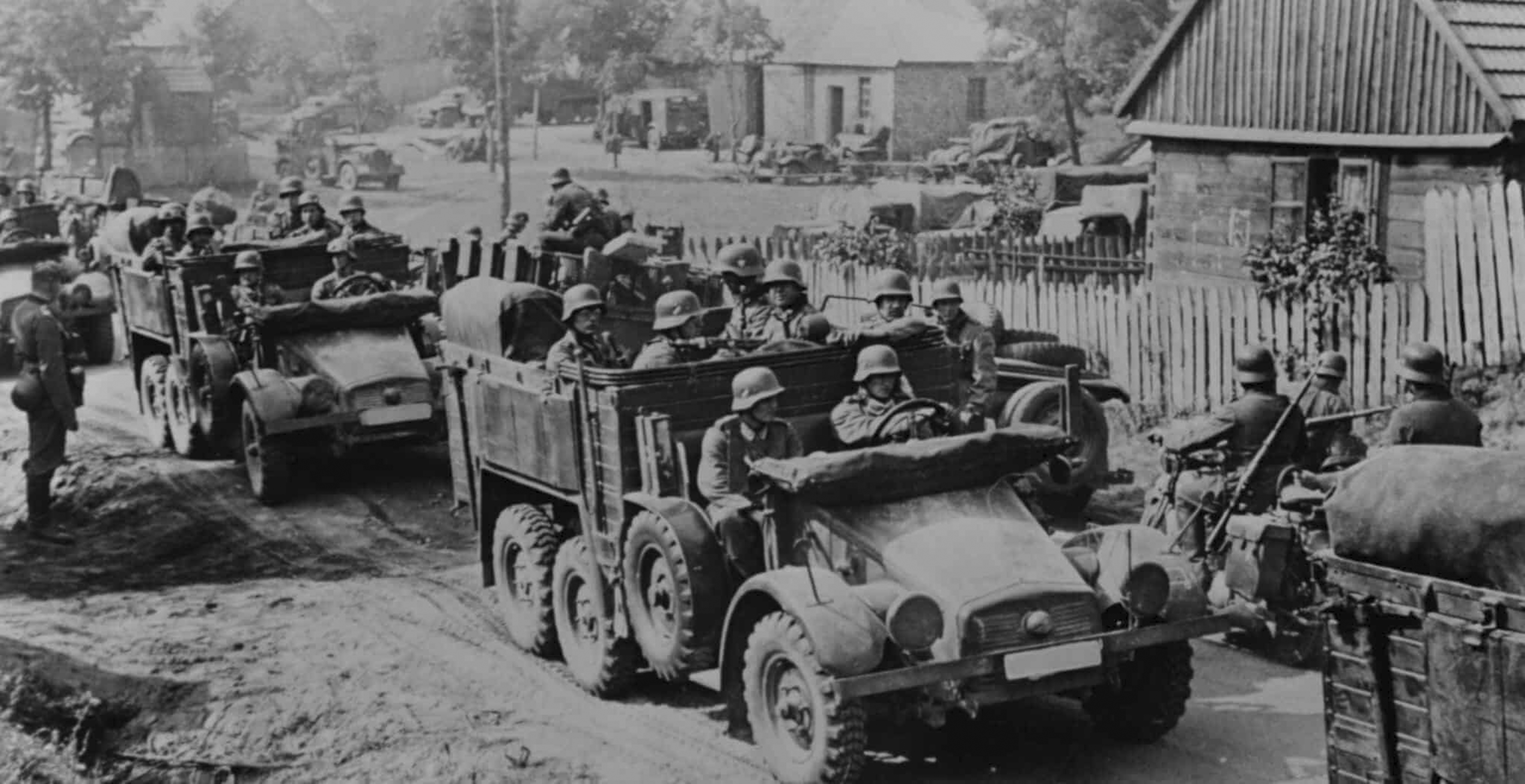 Německá motorizovaná pěchota na nákladních automobilech značky Krupp. V počátku války však většinou vojáci šlapali po svých.