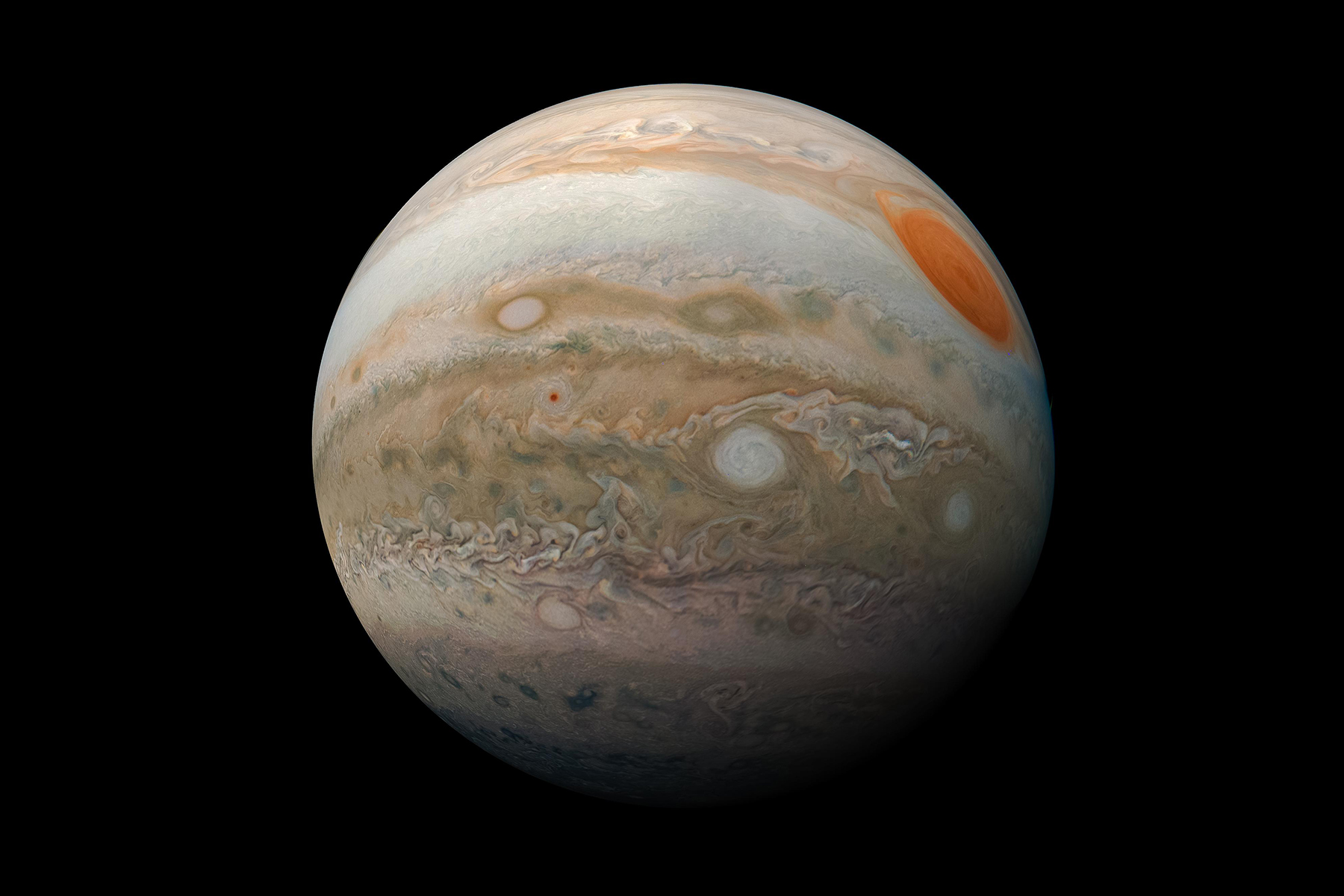 Ze snímků Jupitera je patrné, že se jedná o nejbouřlivější planetu v naší soustavě. Vírových struktur najdeme v tamní atmosféře doslova stovky: některé představují cyklony, tedy oblasti nízkého tlaku, podobně jako pozemské hurikány; jiné anticyklony, tj. oblasti vysokého tlaku. (foto: NASA/JPL-Caltech/SwRI/MSSS, Kevin M. Gill, CC BY 4.0)