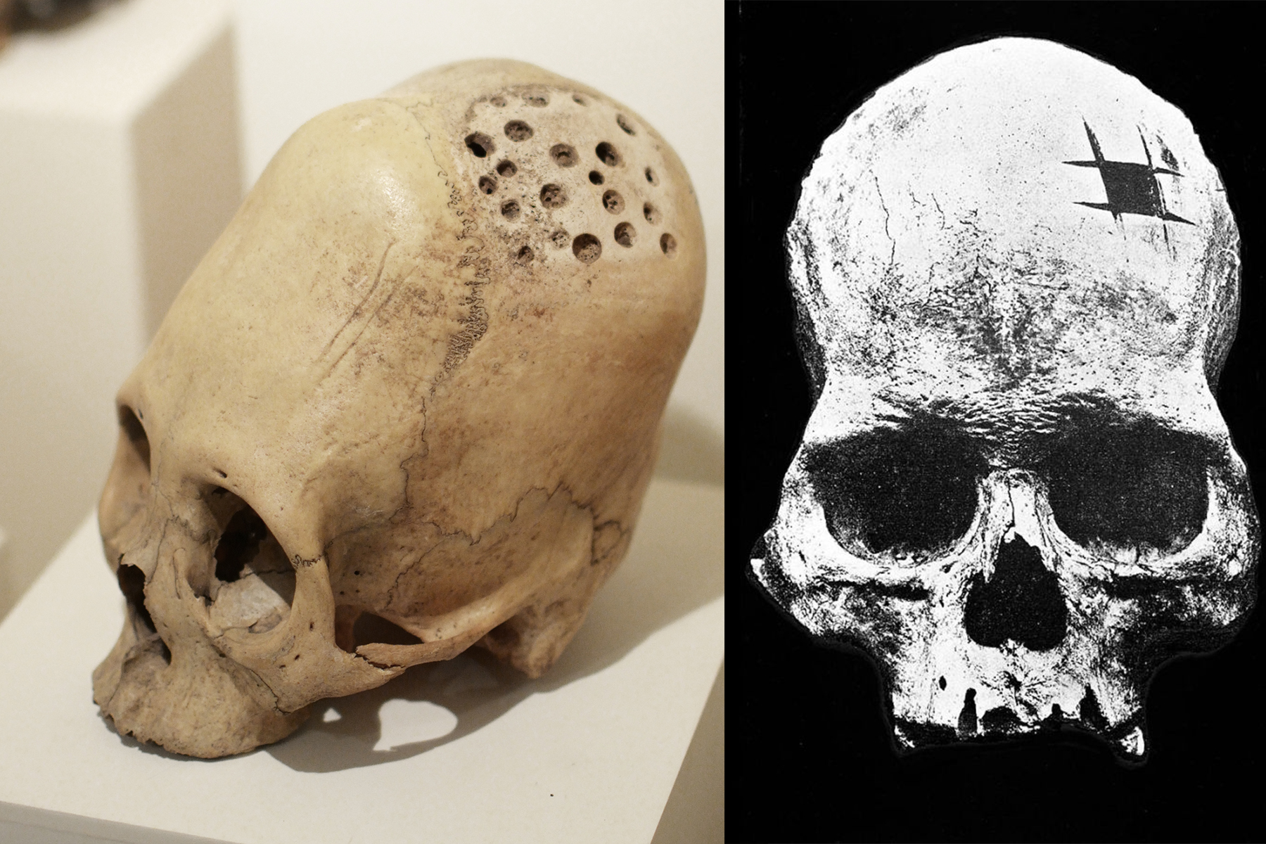 • Vlevo Trepanace na incké lebce nalezené v Peru. Vpravo nákres operované incké lebky ze sbírky amerického archeologa Ephraima Georga Squiera.
