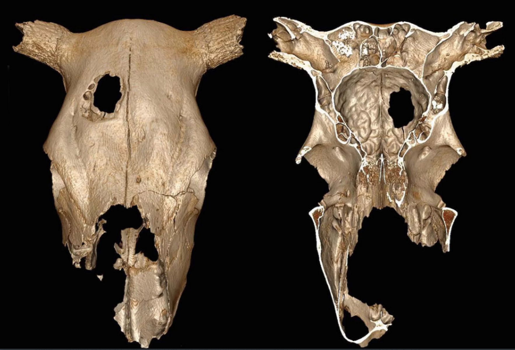 • Počítačový model kravské lebky s velkým otvorem v mozkovně, kterou našli archeologové v jednom z obranných příkopů pevnosti v Champ-Durand.