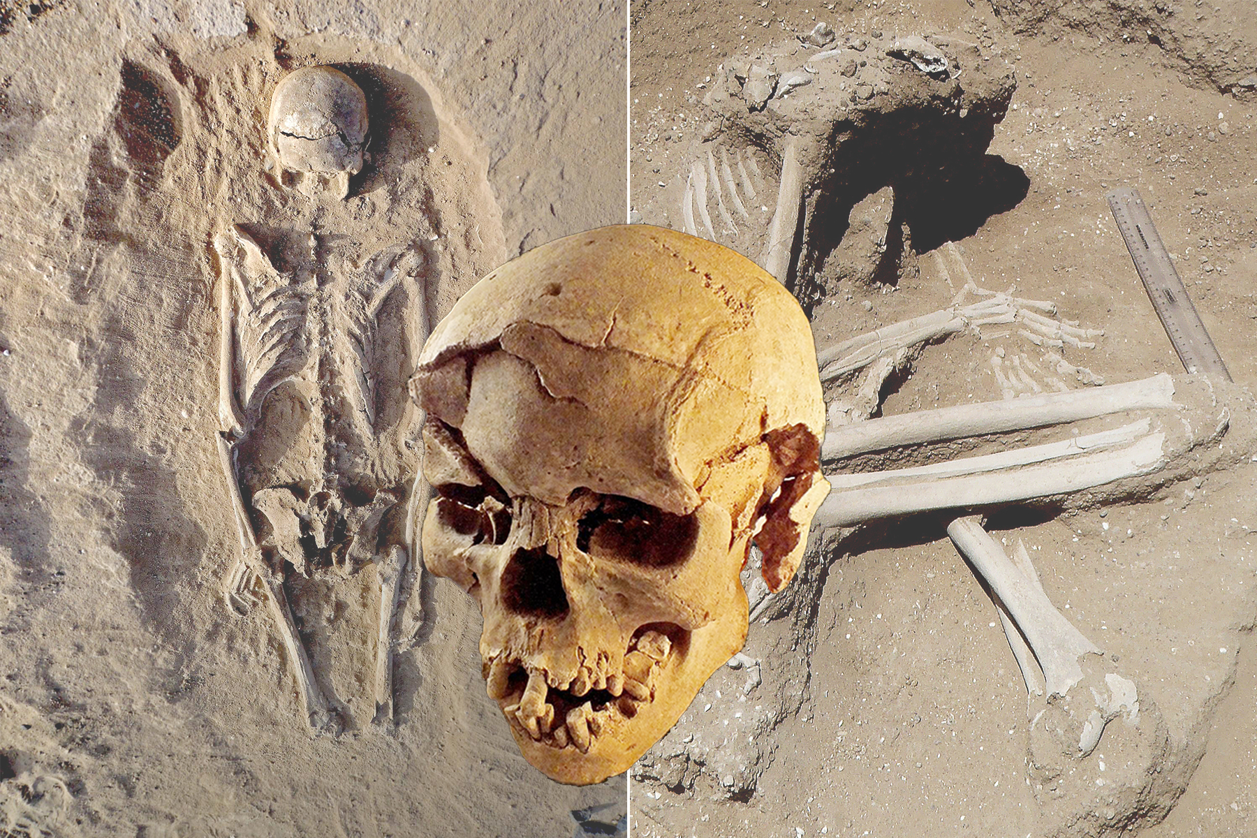 Ostatky brutálně ubitého muže (vlevo) pohřbila laguna, která dříve tlupě skýtala obživu. Ženě (vpravo), která měla přelámané obě nohy, útočníci před smrtí patrně spoutali ruce. Pod jejím tělem se našla kostra ryby.