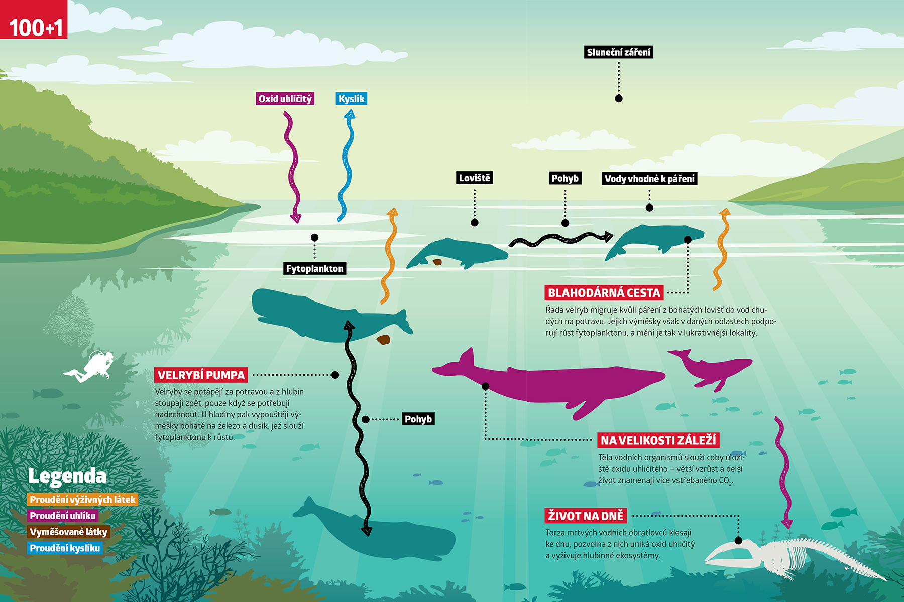 Velryby se potápějí za potravou a z hlubin stoupají zpět, pouze když se potřebují nadechnout. U hladiny pak vypouštějí výměšky bohaté na železo a dusík, jež slouží fytoplanktonu k růstu.