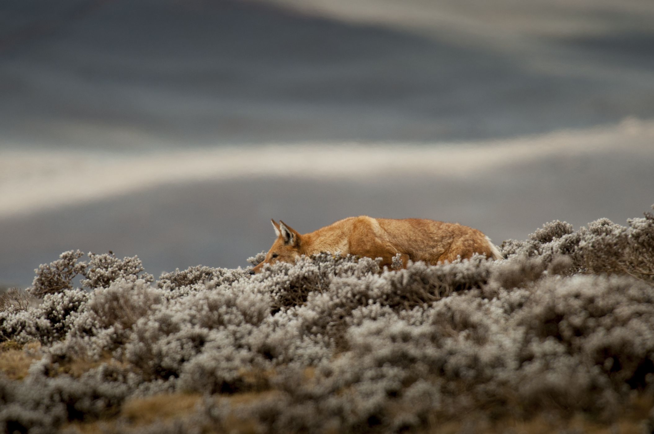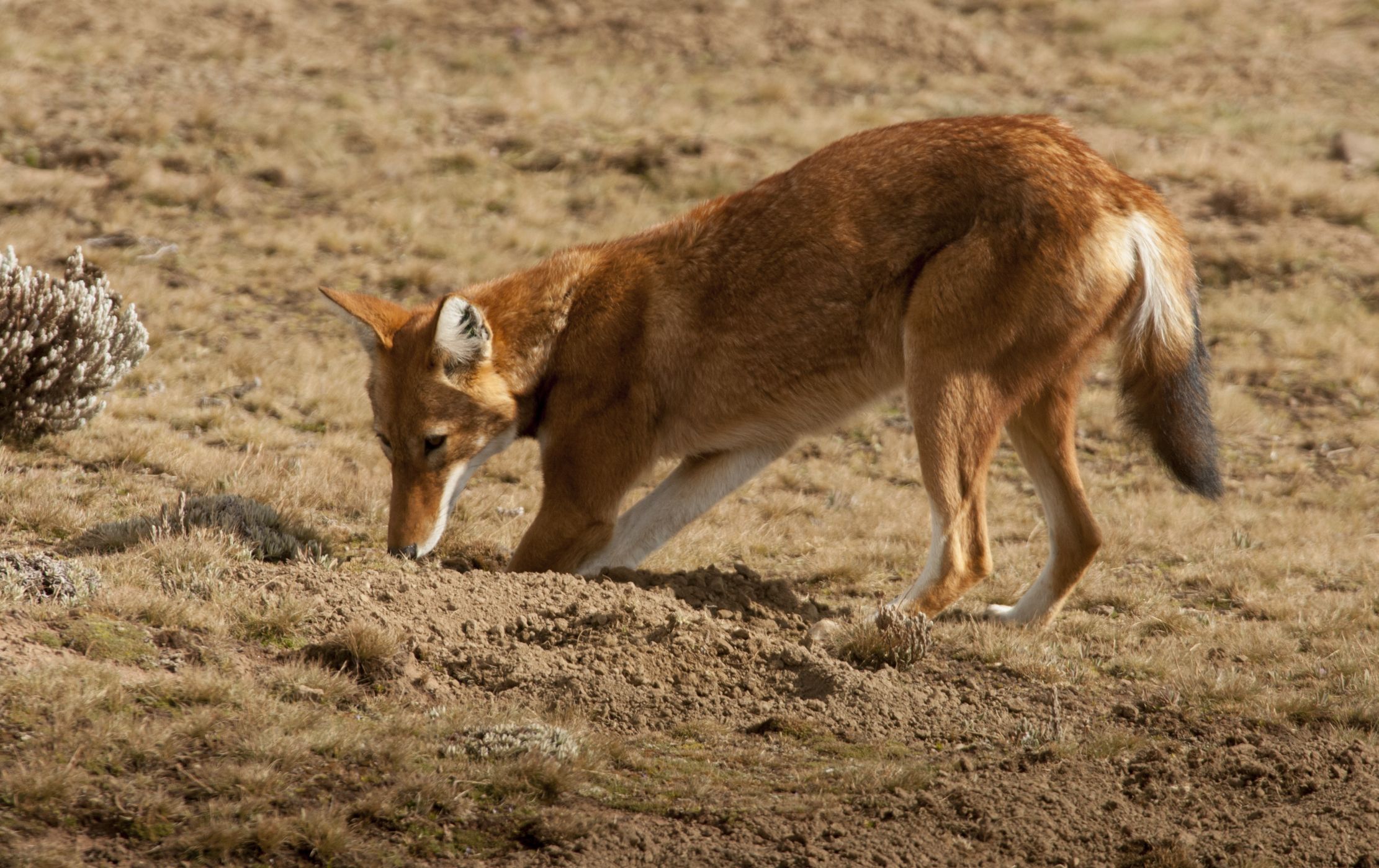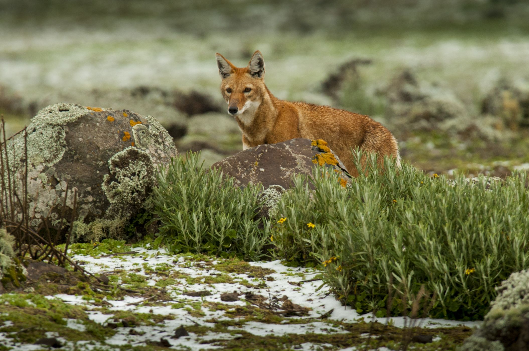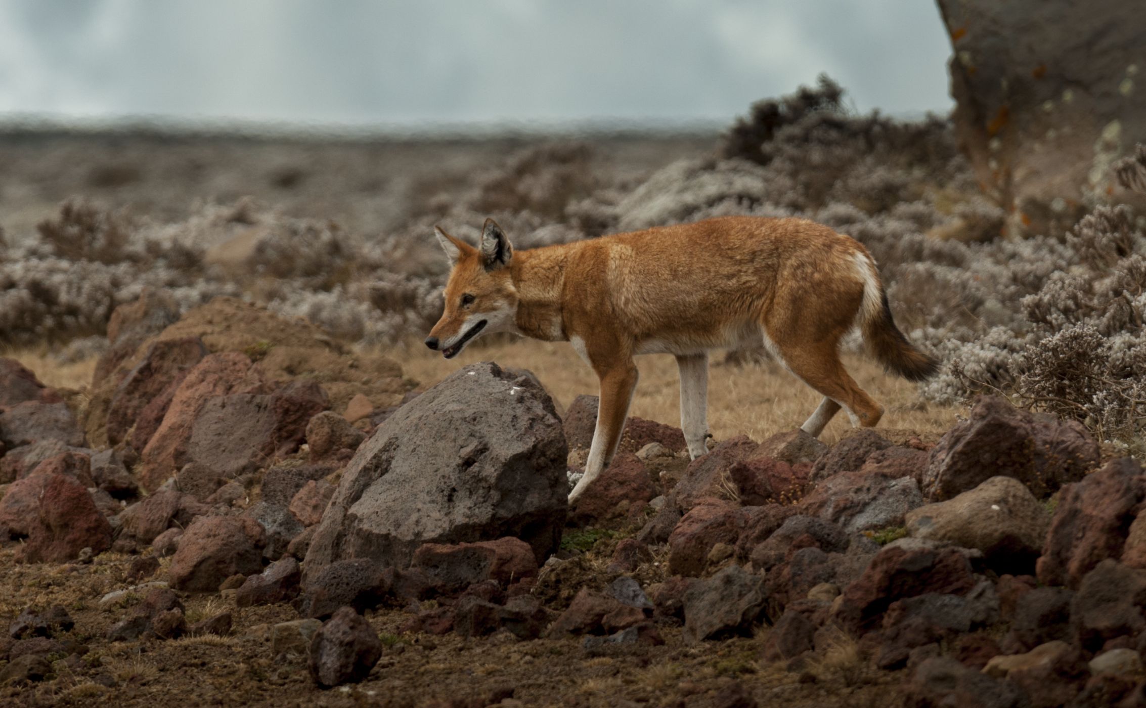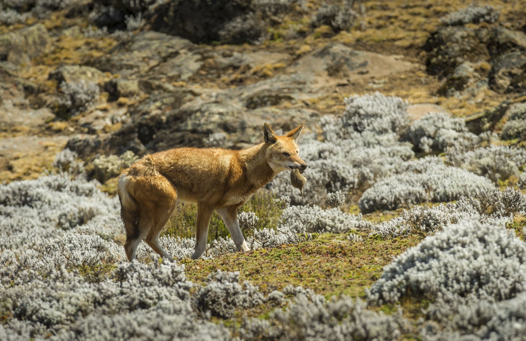 Vlček etiopský v typickém prostředí náhorní plošiny Senetti Plateau.