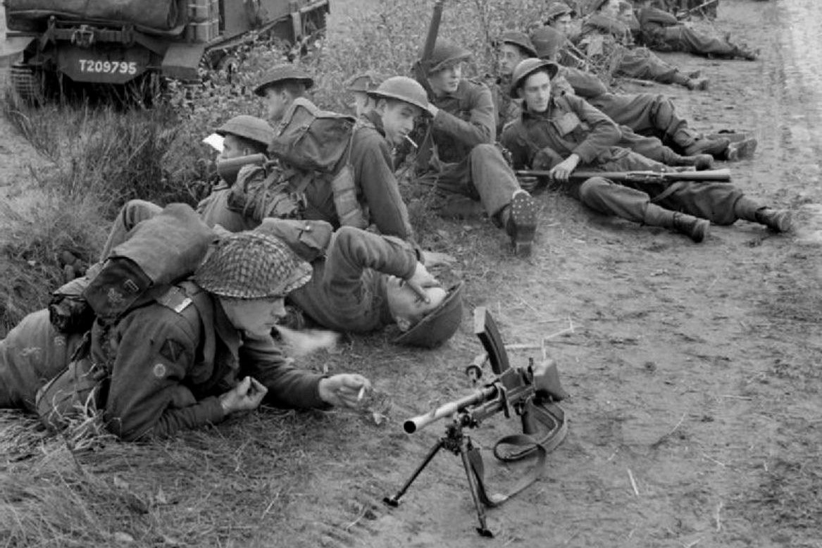Příslušníci 8. praporu Royal Scots odpočívají během útoku na Tilburg.