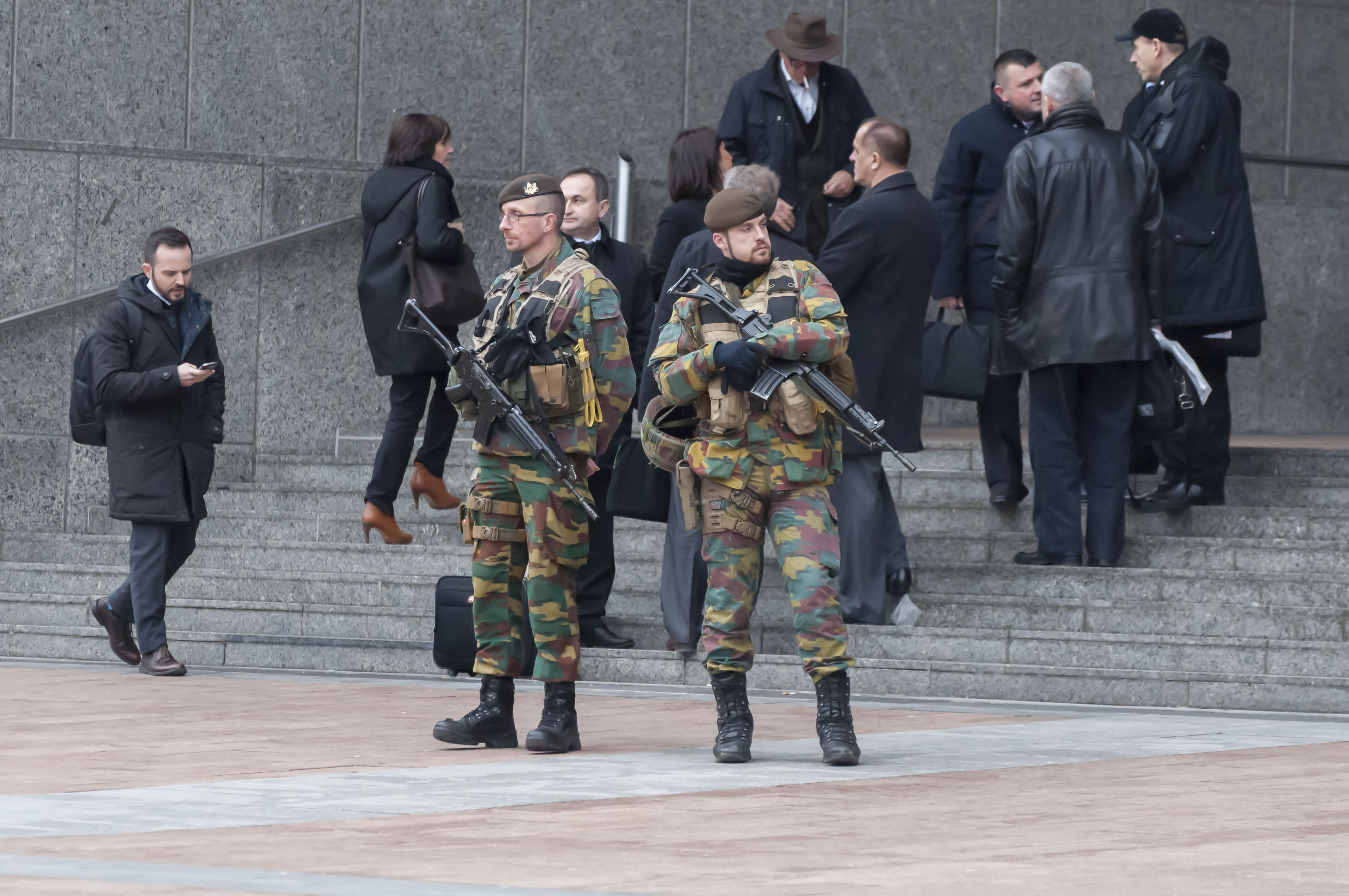 Strach z všudypřítomného terorismu – belgičtí vojáci stráží vstup do Evropského parlamentu.