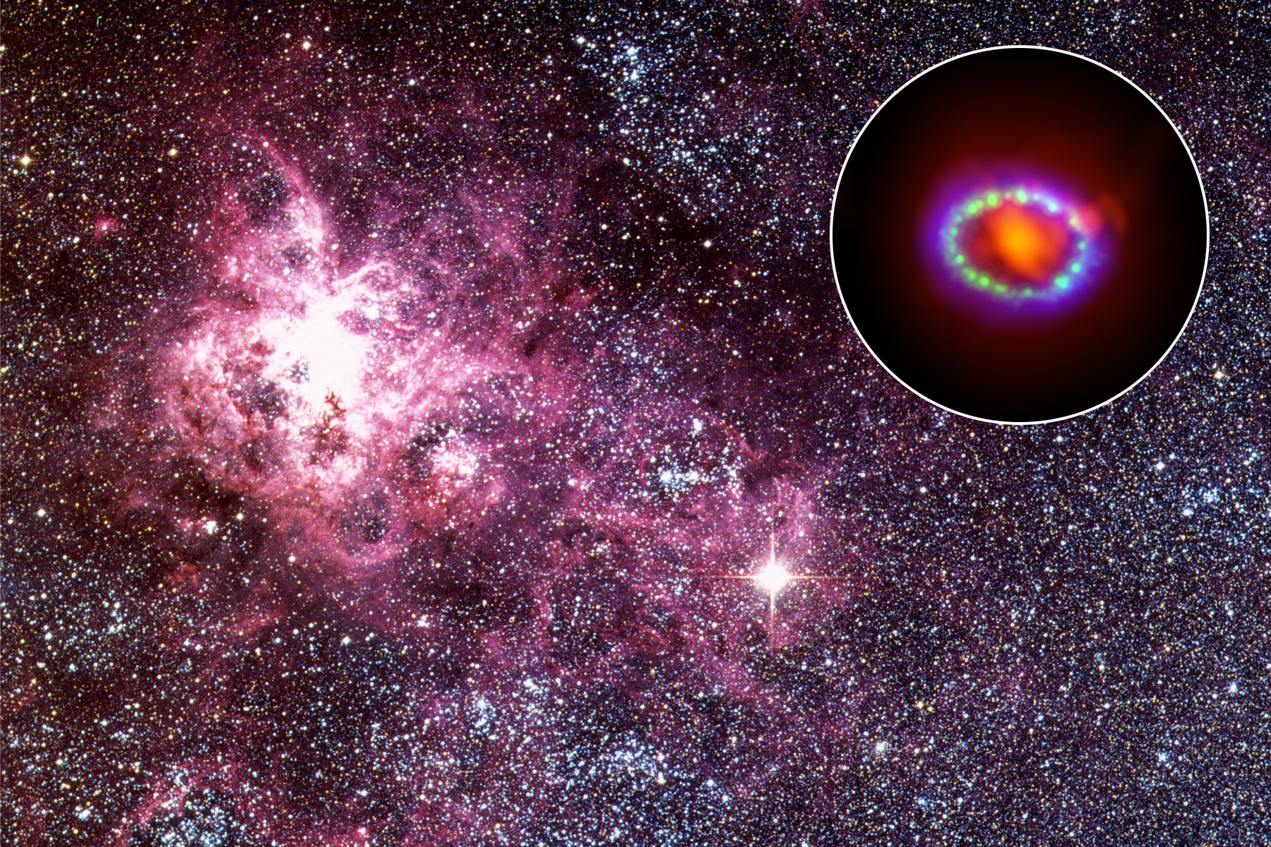 Mlhovina Tarantula ve Velkém Magellanově mračnu. Supernova 1987A je jasně viditelná jako velmi jasná hvězda uprostřed vpravo. Ve výřezu pozůstatek po výbuchu supernovy SN 1987A. Rentgenová data z kosmické observatoře Chandra (modře) zachycují expandující rázovou vlnu.