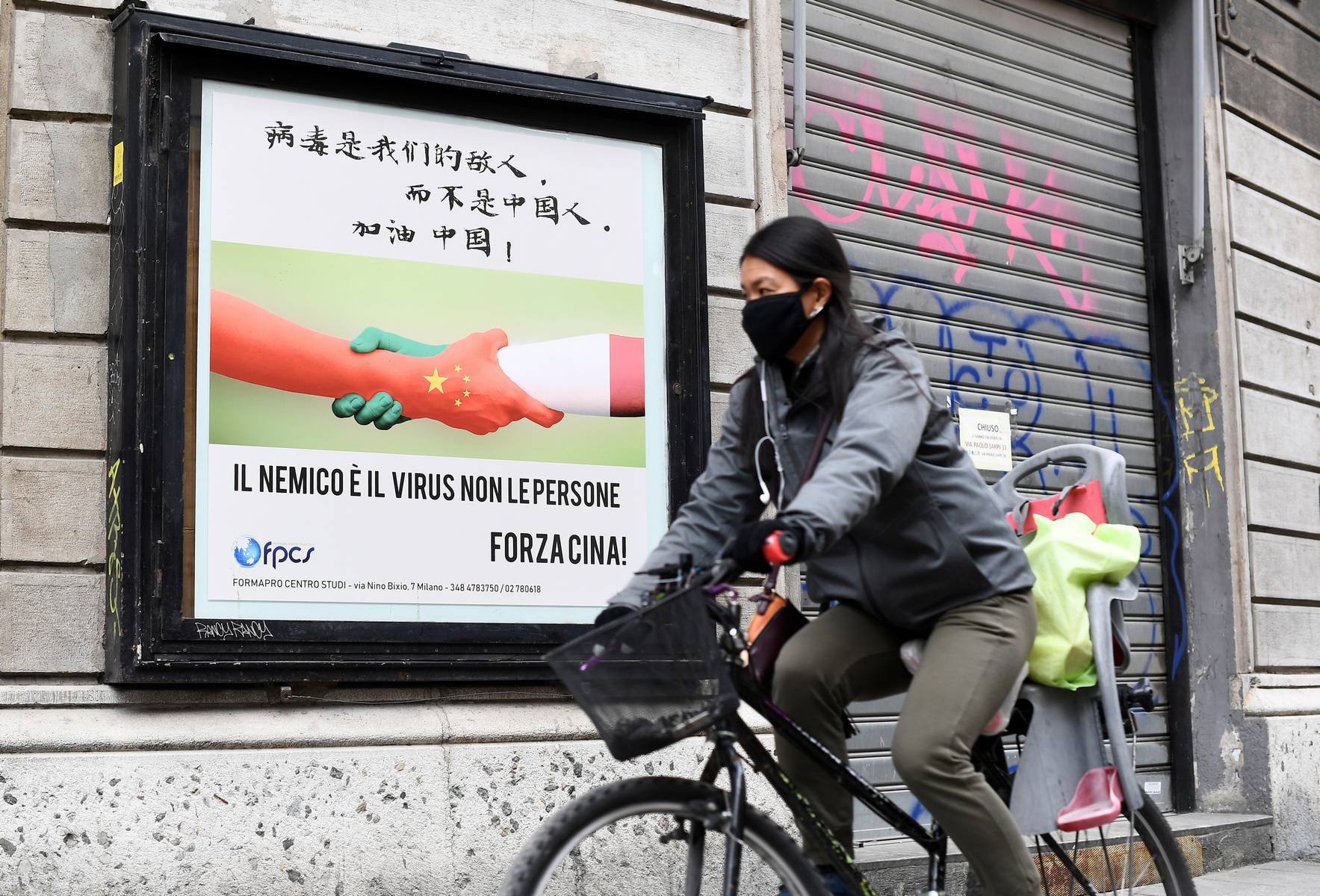 Čína investuje do PR kampaně. Na severu Itálie přesvědčuje místní, že pro ně dělníci z lidové republiky nepředstavují hrozbu. Na plakátu stojí: „Nepřítelem je virus, nikoliv lidé.“