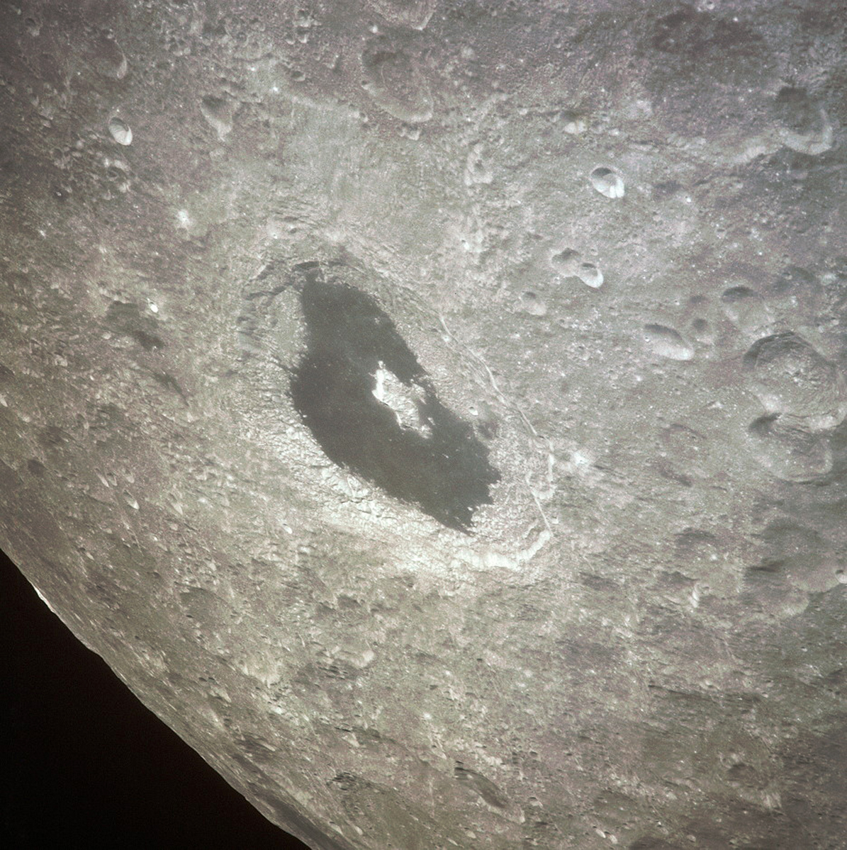Měsíc fotografovaný posádkou Apolla 13 během jediného průletu, na snímku kráter Ciolkovského.