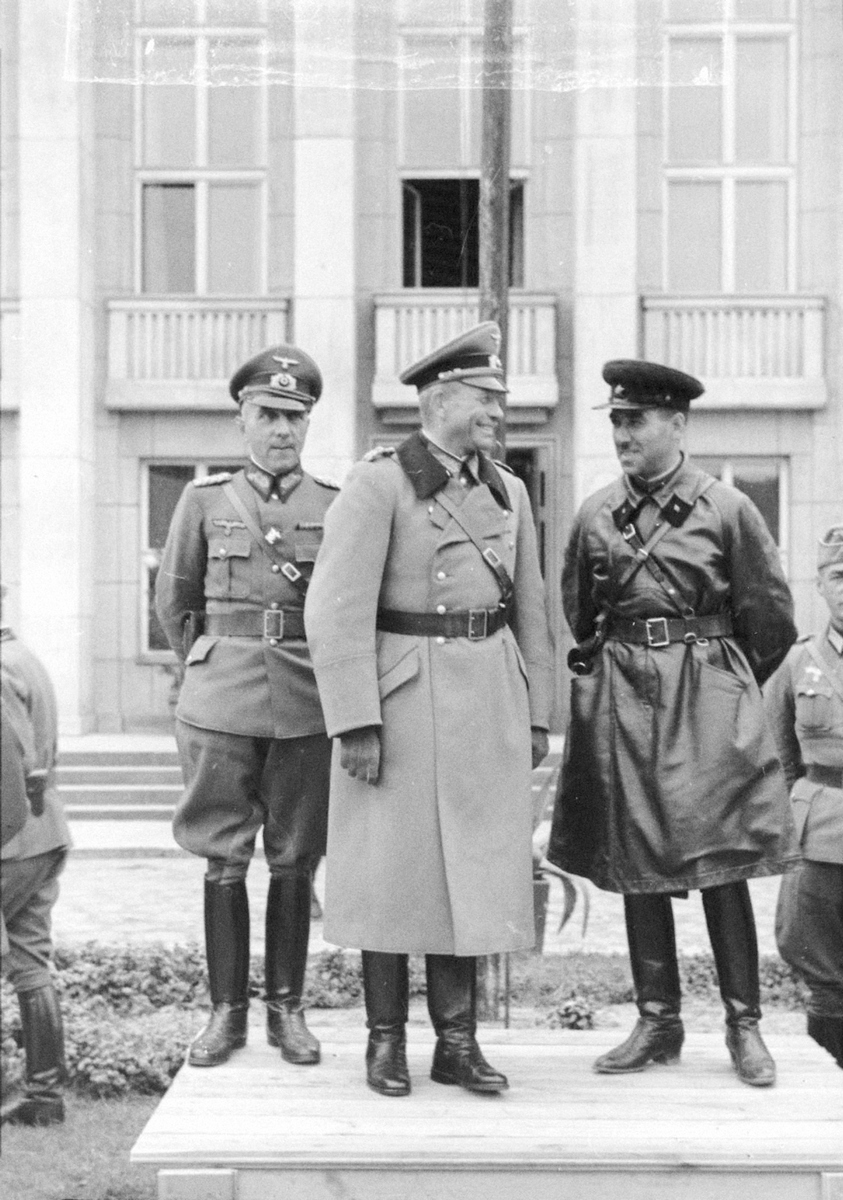 • Německý generál Heinz Guderian, po jeho boku stojí kombrig (brigádní generál) Semjon Krivošejn, vlevo generál Mauritz von Wiktorin. (foto: Wikimedia Commons, Bundesarchiv, CC BY-SA 3.0 DE)
