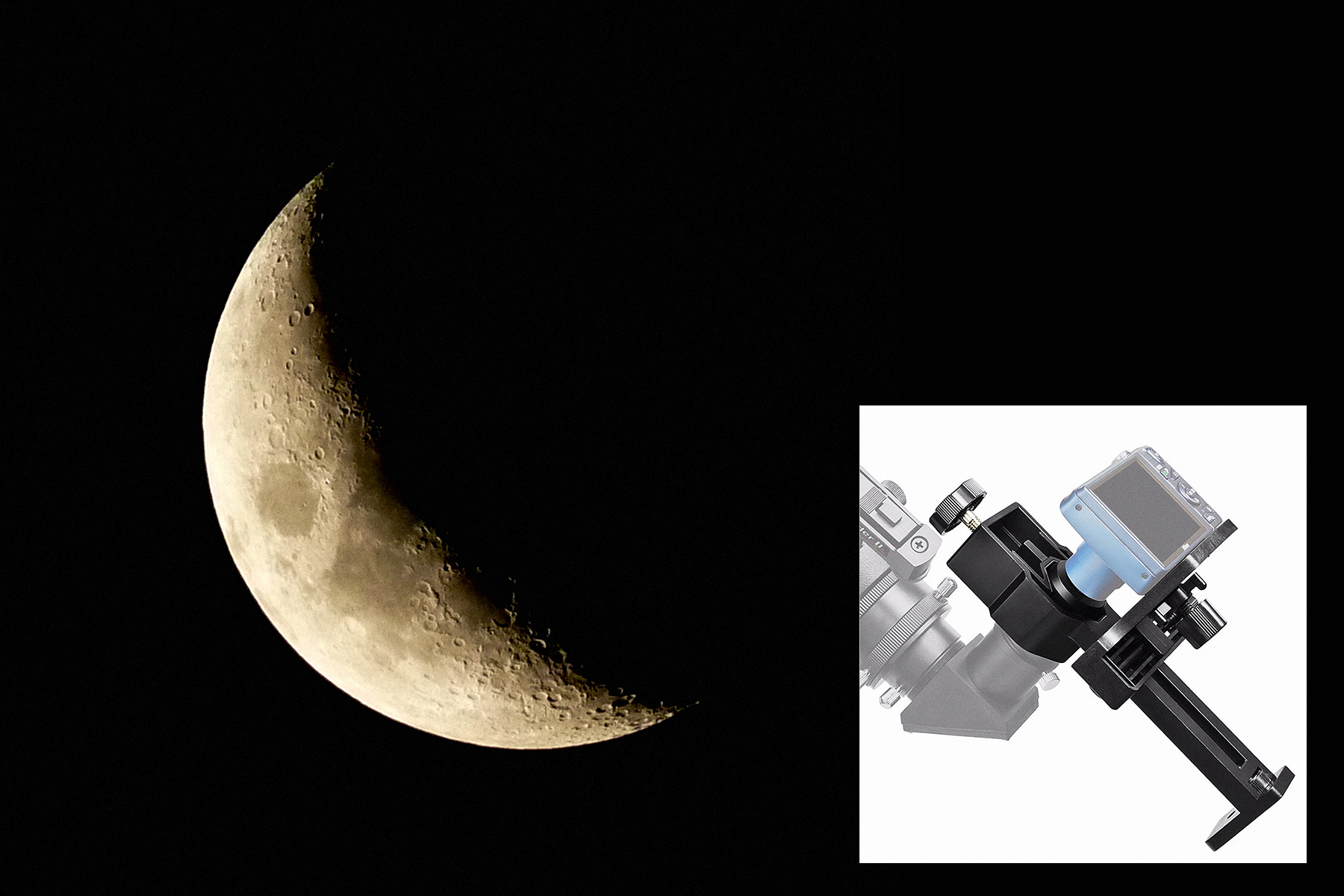 Fotografie Měsíce pořízená afokálně kompaktním digitálním fotoaparátem Panasonic Lumix DMC-FX550 v kombinaci s čočkovým dalekohledem Meade APO 80/480 a okulárem o ohnisku 18 mm. Doba expozice činila 1/100 sekundy při citlivosti ISO 400. Při výběru vhodného držáku záleží v prvé řadě na tom, zda pracujete s kompaktním fotoaparátem, či s mobilním telefonem. Každý se totiž do držáku upíná jiným způsobem