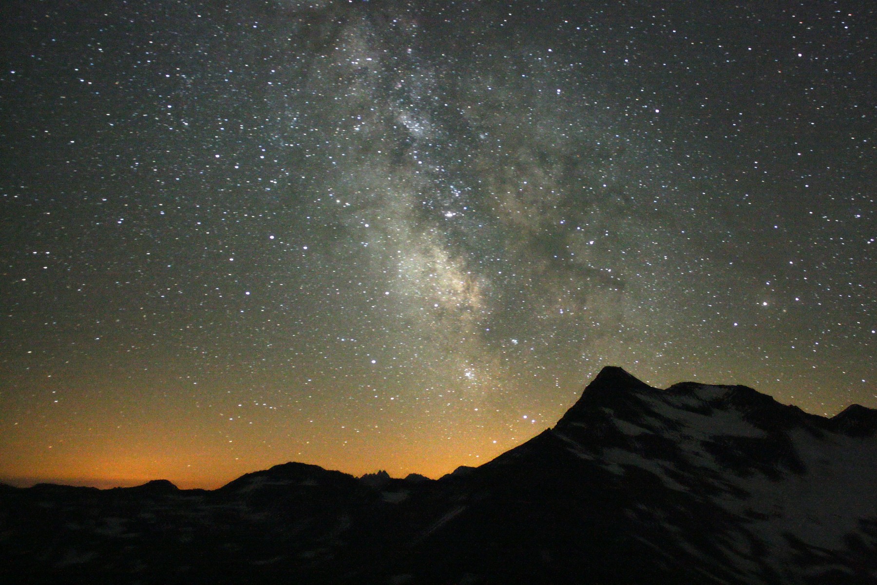 Fotografie oblohy pořízená fotoaparátem Canon EOS 1000D, expozice 3×30 sekund. Všimněte si rozmazaných hvězd v důsledku pohybu oblohy během dlouhé expozice.