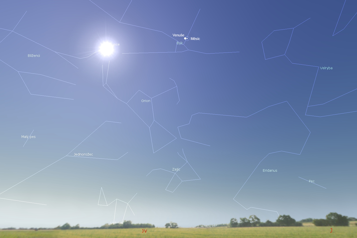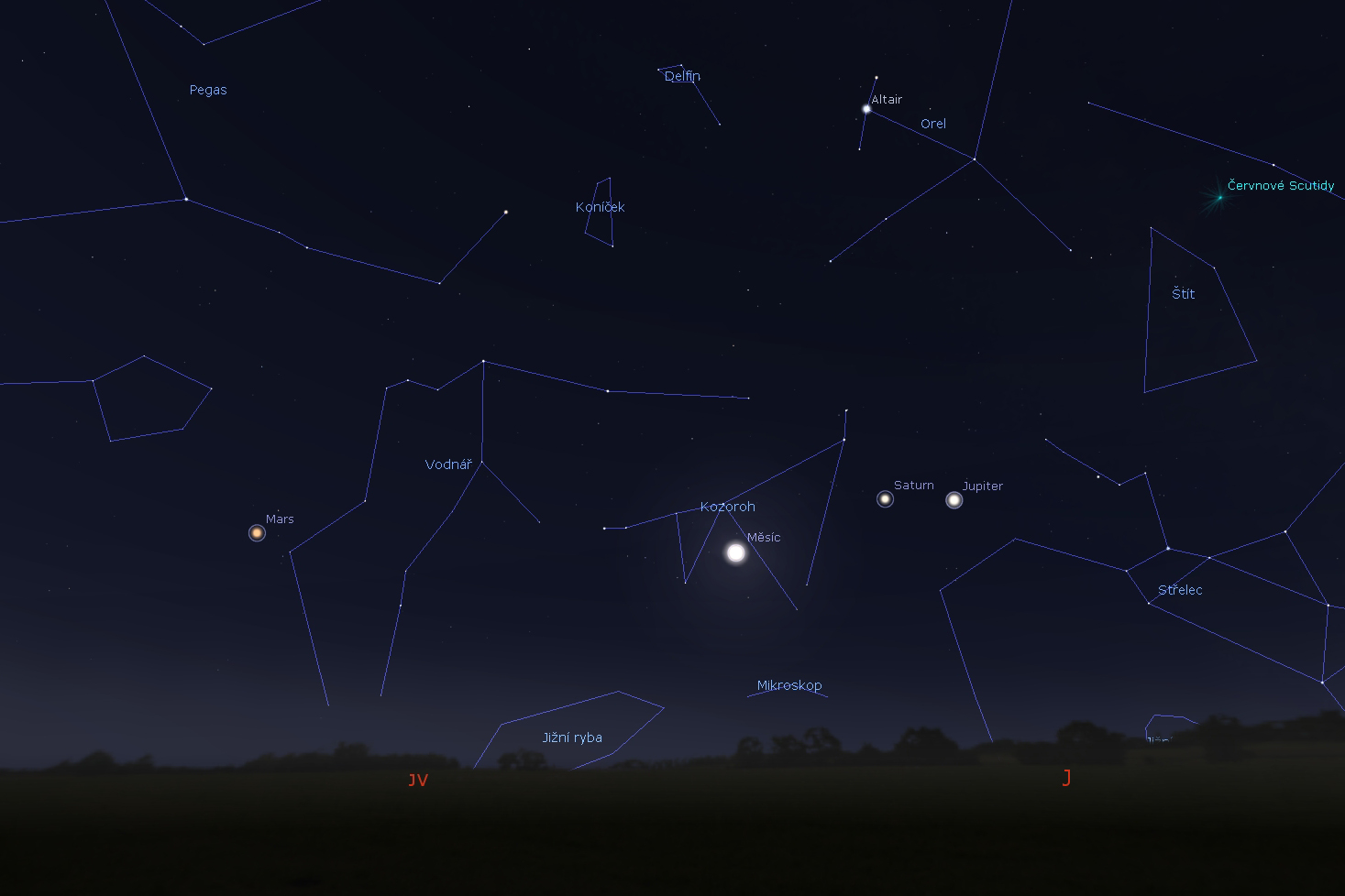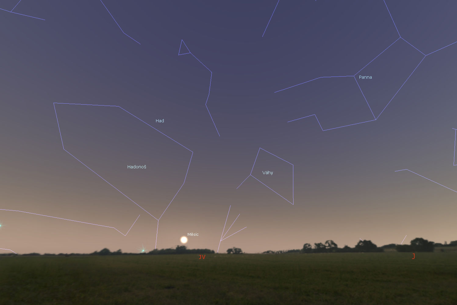 Obdélníková mapa uvádí přibližné polohy významných těles Sluneční soustavy na červnové obloze. U Měsíce jsou zvýrazněny pozice (včetně přesného data), kdy nastává první čtvrt, úplněk, poslední čtvrt a nov. Pohyb Slunce, Měsíce a planet mezi souhvězdími za uvedené období naznačují křivky ve střední části mapy.