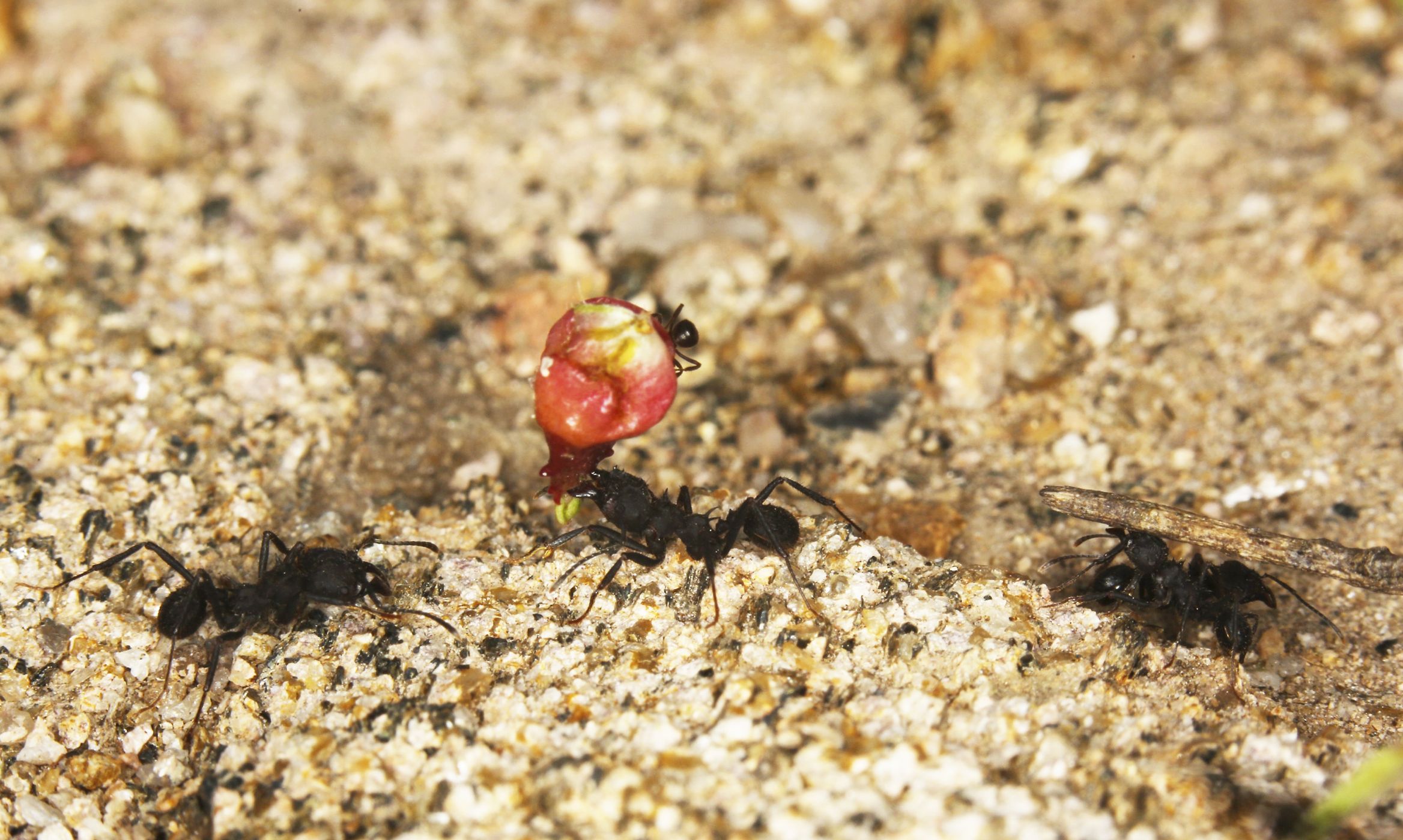 Při pozorném pohledu uvidíte na horní části červeného kvítku drobného mravence, který je překvapivě důležitým společníkem většího a silnějšího nosiče.