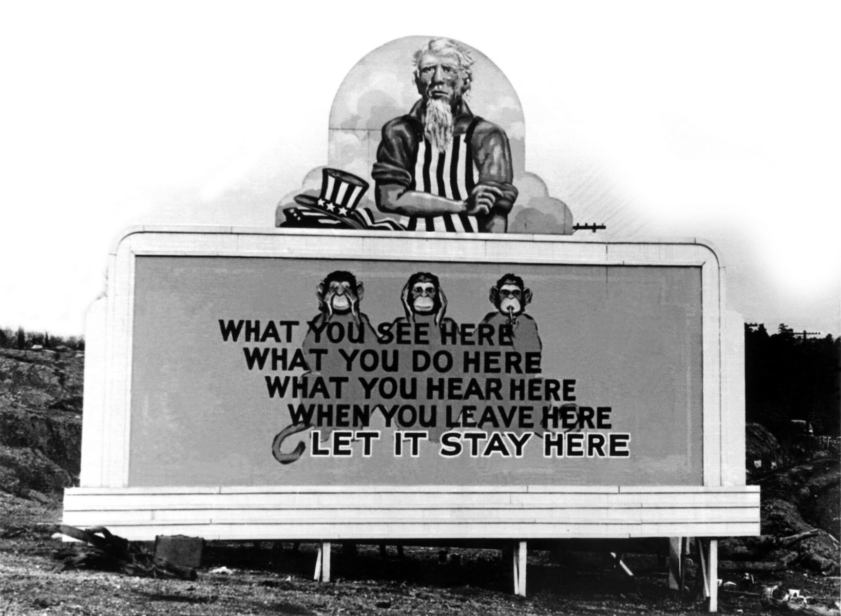 Cedule vyzývá zaměstnance továrny v Oak Ridge, aby nemluvili o tom, co na místě uvidí.