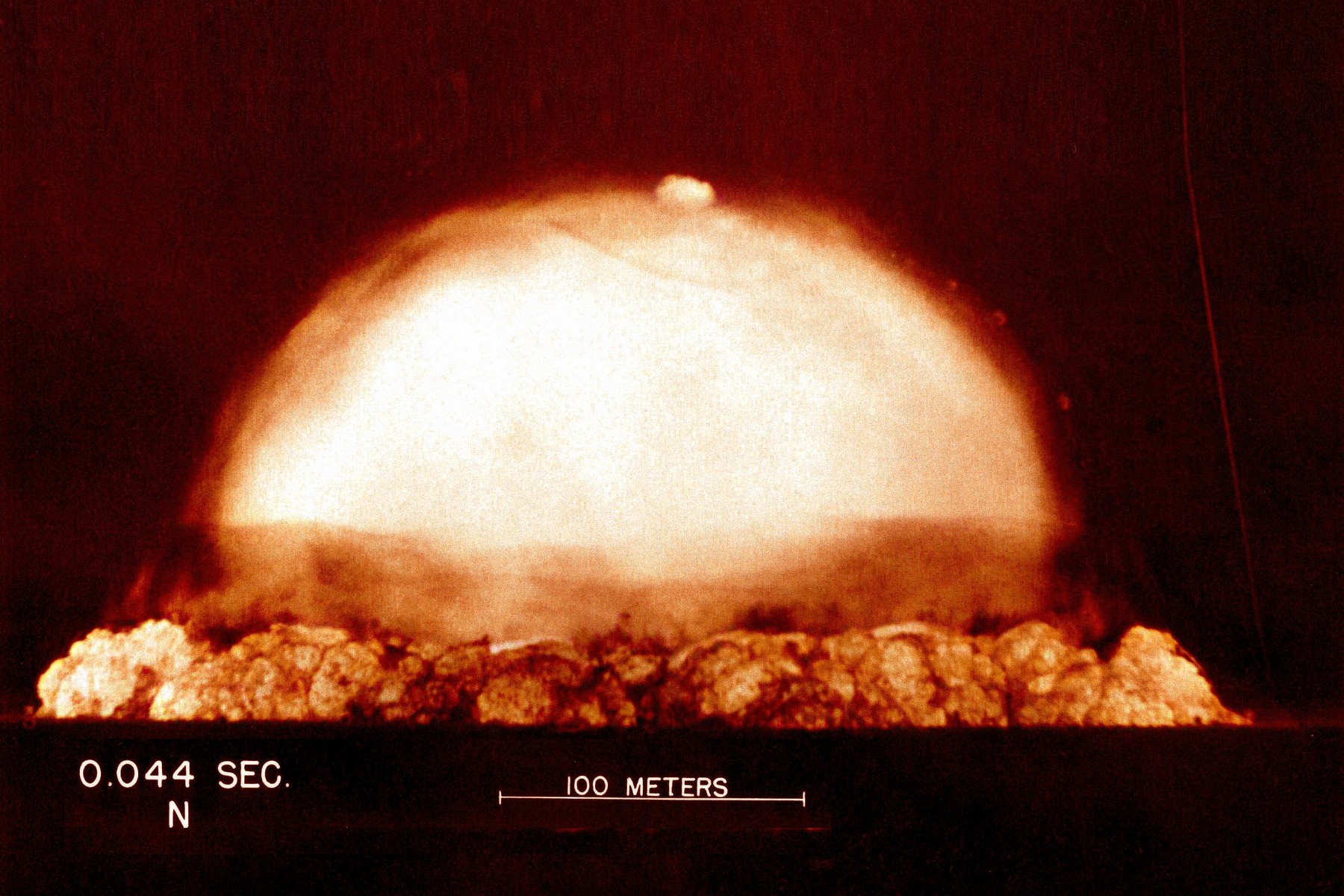Pokusný výbuch na střelnici Trinity, 0,044 sekundy po iniciaci štěpné reakce. Tvůrci bomby zůstali v němém úžasu.