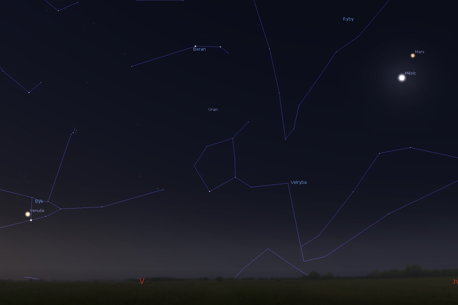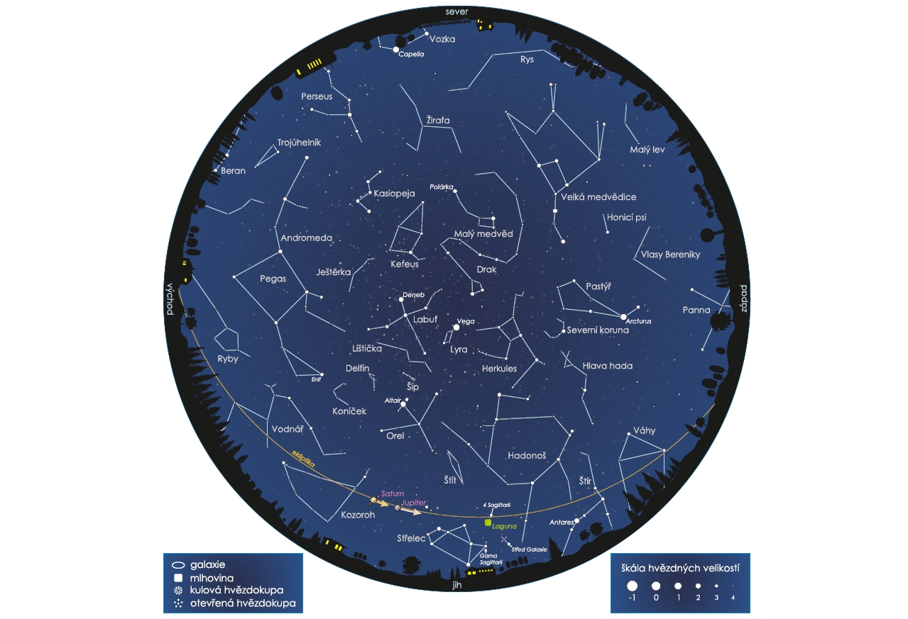 • Kruhová mapa zobrazuje podobu nočního nebe na přelomu července a srpna 2020 ve 23:00 středoevropského letního času (SELČ).