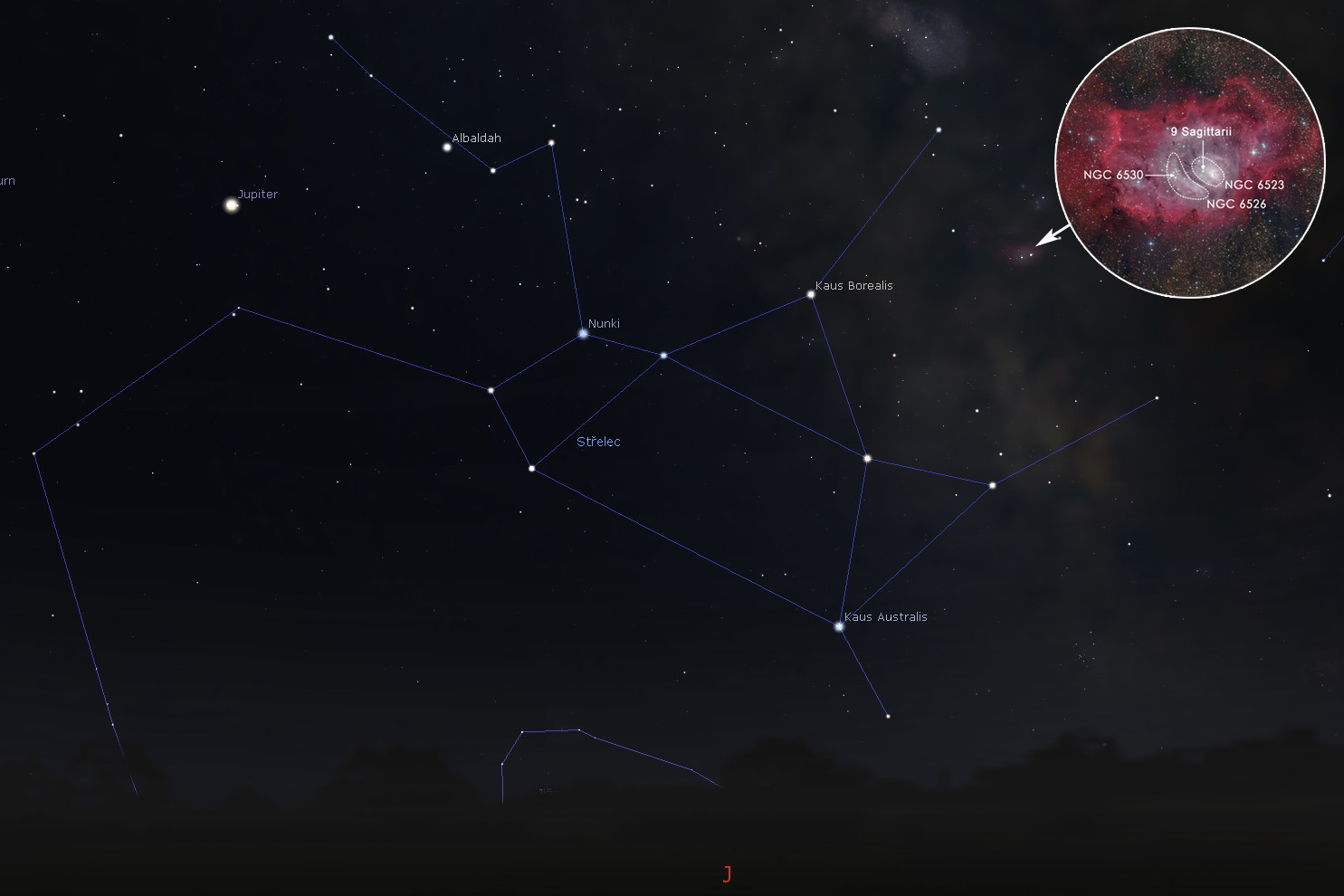 • Pouhýma očima bohužel Lagunu tak jako na fotografii nespatříte. Dalekohled však ukáže alespoň její nejjasnější partie, vyznačené na snímku.