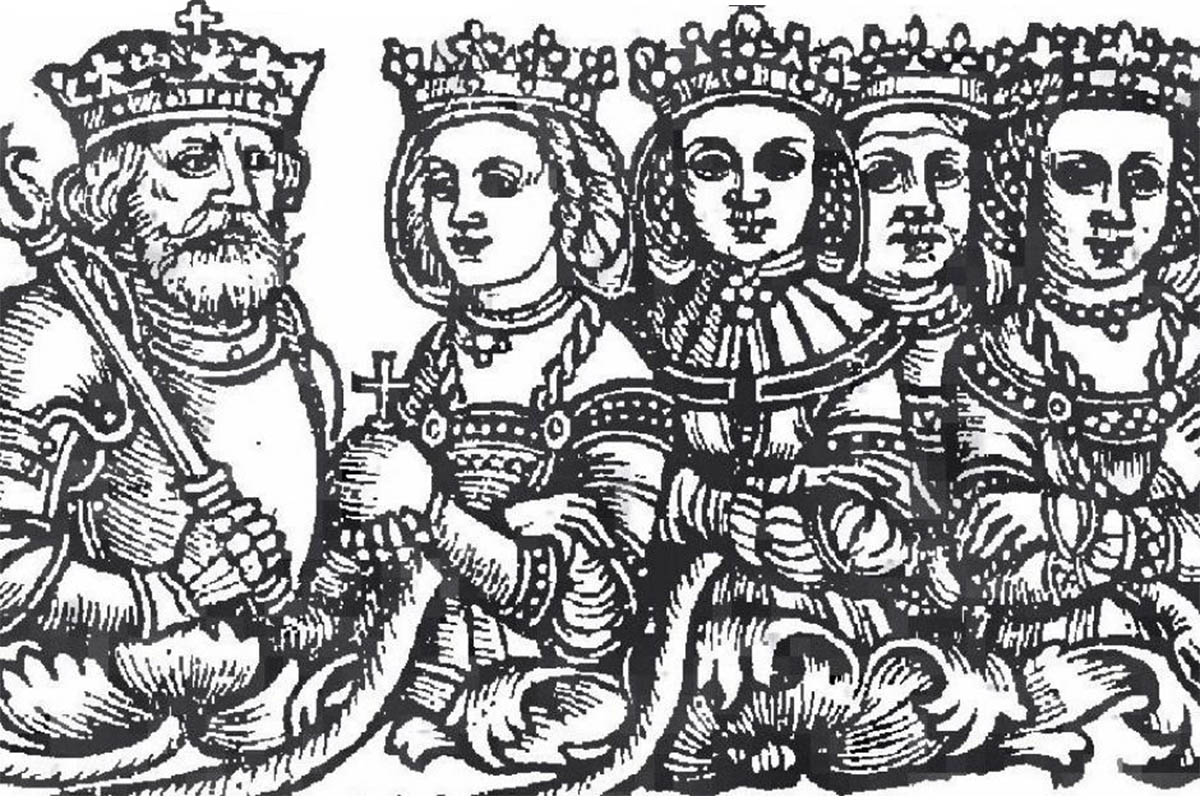 Vladislav II. Jagello a jeho čtyři manželky - Hedvika z Anjou, Anna Celjská, Alžběta z Pilicy a Sofie Litevská.