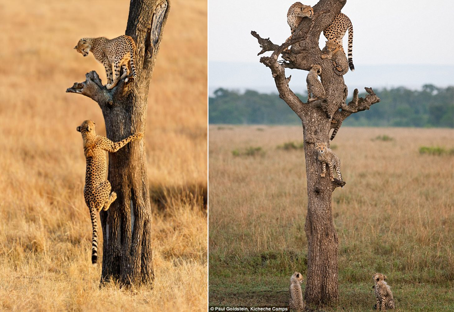 Jak dosvědčuje i tento snímek, vylézt na nízké větve stromů není pro gepardy až takový problém.