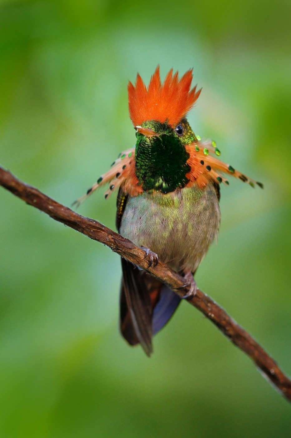 Kolibřík ozdobný (Lophornis ornatus) s charakteristickým oranžovým límcem.