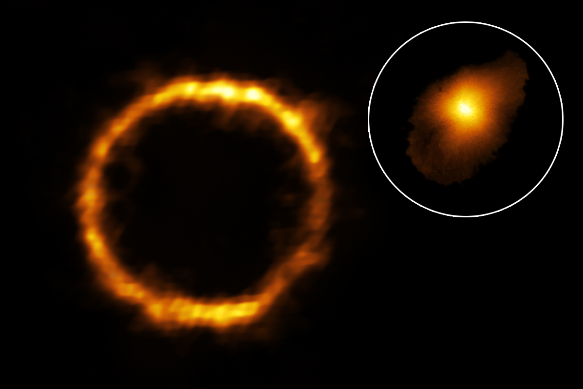 Galaxie SPT0418-47 zobrazená gravitační čočkou. Ve výřezu její rekonstruovaný skutečný tvar.