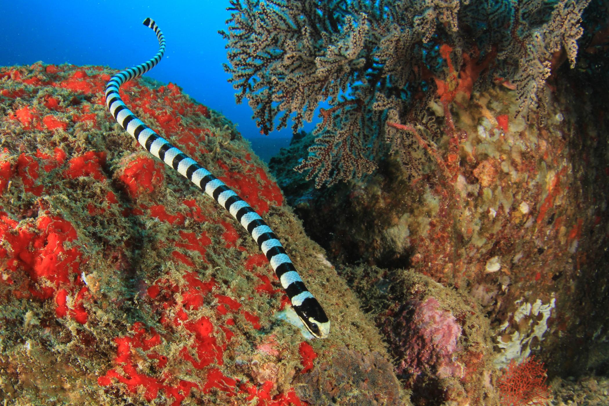 Samci vlnožila užovkového (Laticauda colubrina) dorůstají délky kolem jednoho metru; samičky jsou až o půl metru delší. (foto: Shutterstock)
