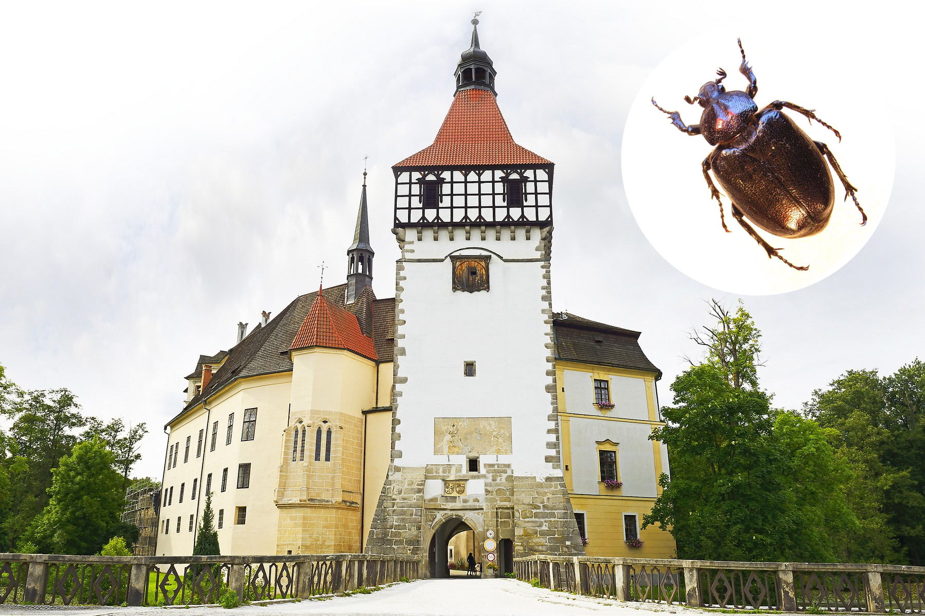 Blatná měla štěstí v neštěstí: Stala se kulisami pohádek a starali se o ni muzejníci. Zámecký park obývá i ohrožený páchník hnědý (ve výřezu) a ochranáři se intenzivně snaží zabránit jeho vymření.