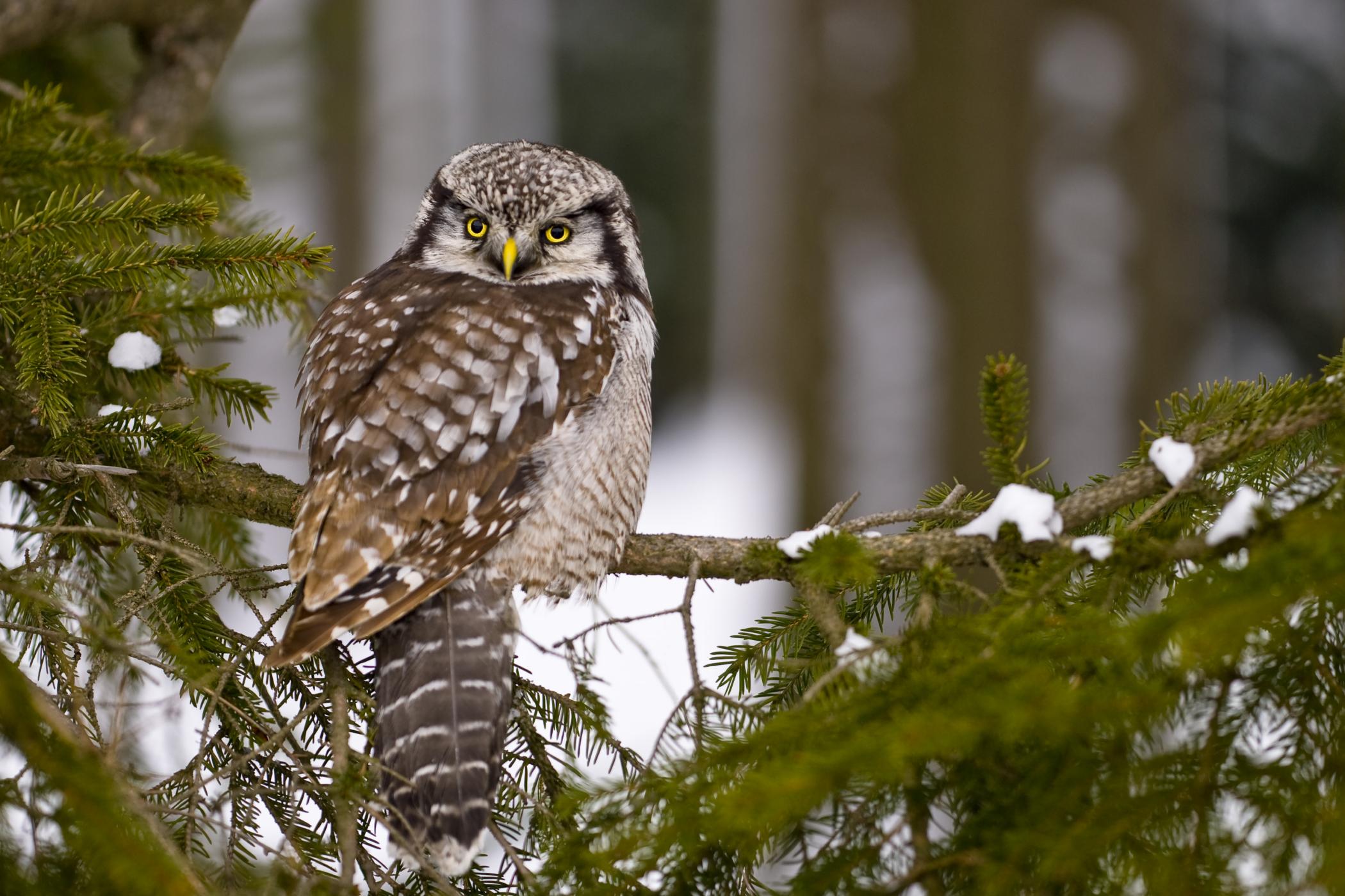 Areál sovice krahujové (Surnia ulula) nejjižněji zasahuje do pohoří Ťan-šan a Tarbagataj. Samice i samec mají vrch hlavy černobíle skvrnitý, na šíji s převládající bílou barvou, hřbet je až po svrchní krovky ocasní černohnědý s málo výrazným světlým skvrněním. (foto: Zdenka Prokešová - se souhlasem k publikování)