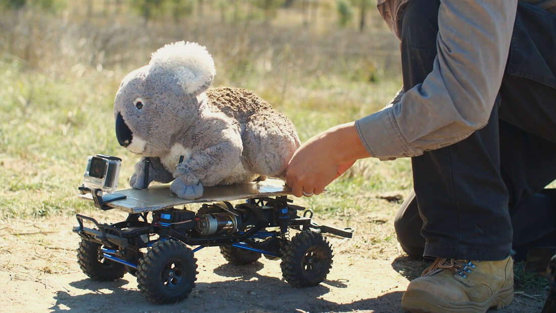 Robotický koala vylepšený koalí močí a trusem pátrá po tom, zda mají krávy sklony ušlapat koaly, když se ocitnou na zemi.