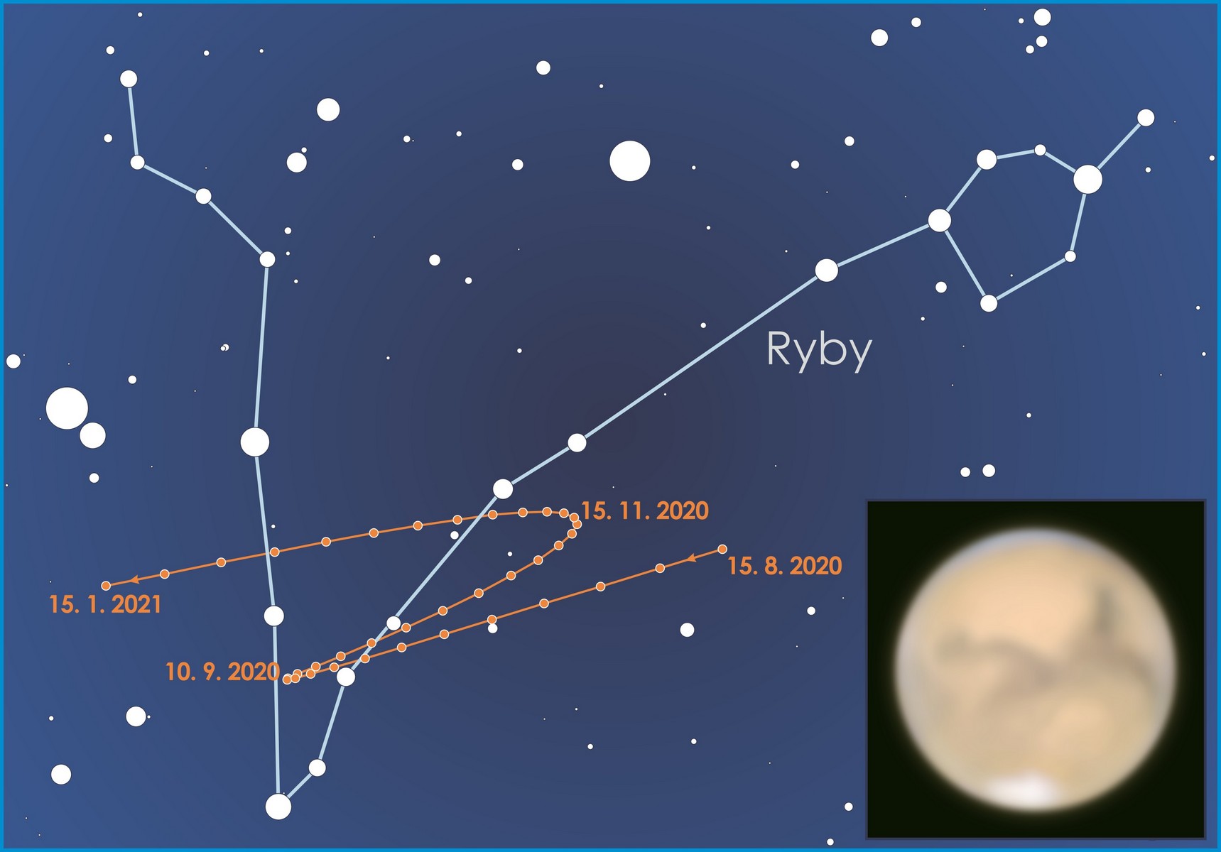 V období kolem opozice opisuje Mars na obloze charakteristické kličky. Ilustrace znázorňuje tu letošní, protínající souhvězdí Ryb. Po vyznačené oranžové dráze se bude planeta pohybovat od 15. srpna 2020 do 15. ledna 2021.