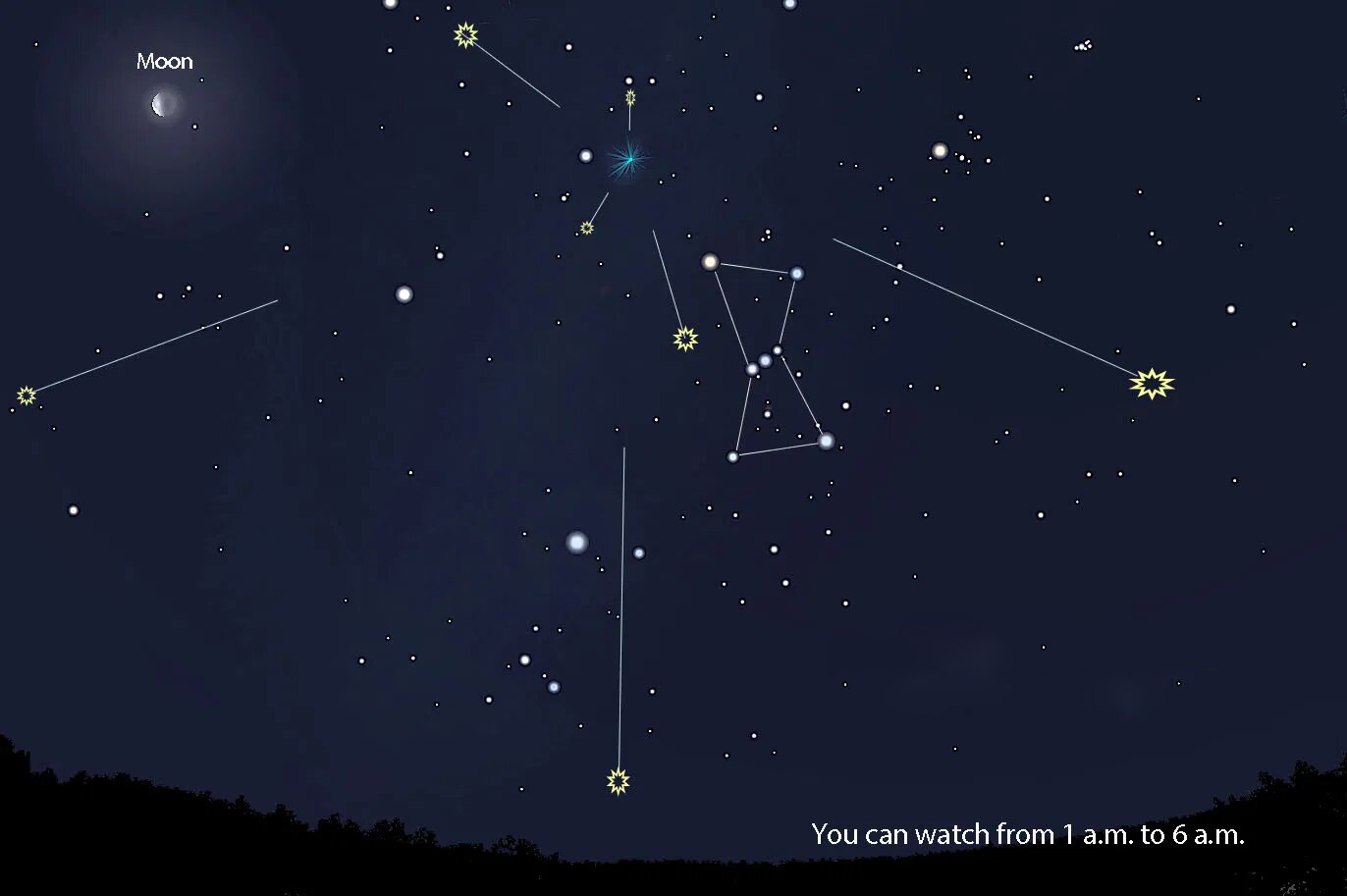 Meteory Orionid pocházející ze známé Halleyovy komety zdánlivě vylétají z bodu (radiantu) ležícího v souhvězdí Orionu.