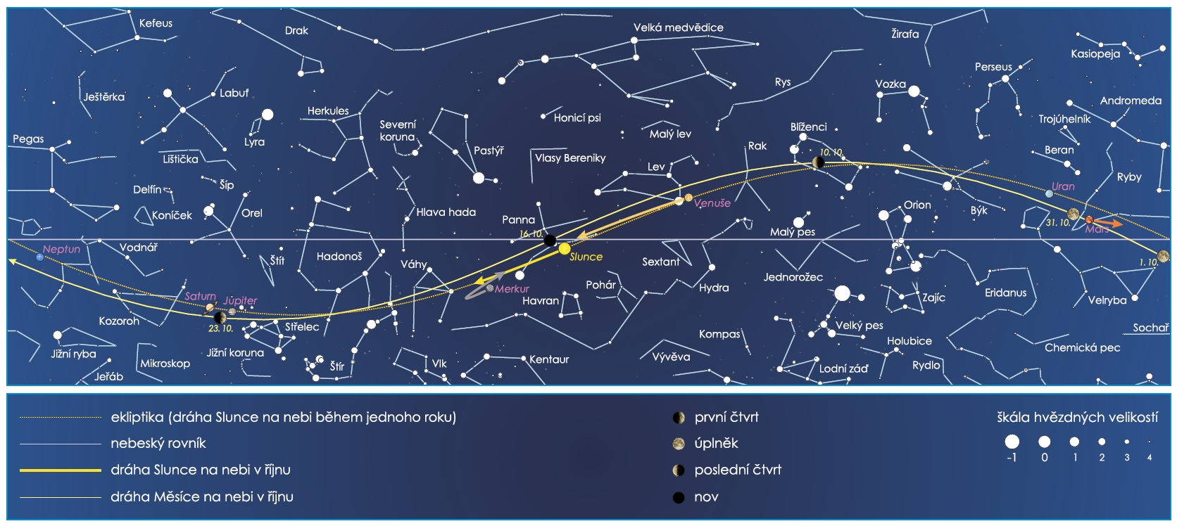 Obdélníková mapa uvádí přibližné polohy významných těles Sluneční soustavy na říjnové obloze. U Měsíce jsou zvýrazněny pozice (včetně přesného data), kdy nastává první čtvrt, úplněk, poslední čtvrt a nov.